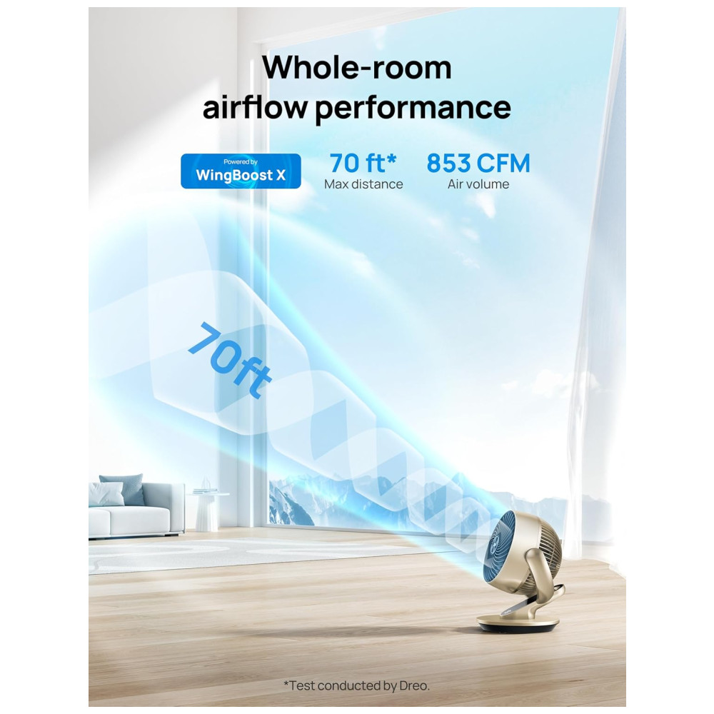 Circulação Completa de Ar: Graças à tecnologia Dreo WingBoost, o ventilador gera ventos que alcançam até 21,3 m de distância, garantindo um resfriamento eficaz em todo o ambiente.