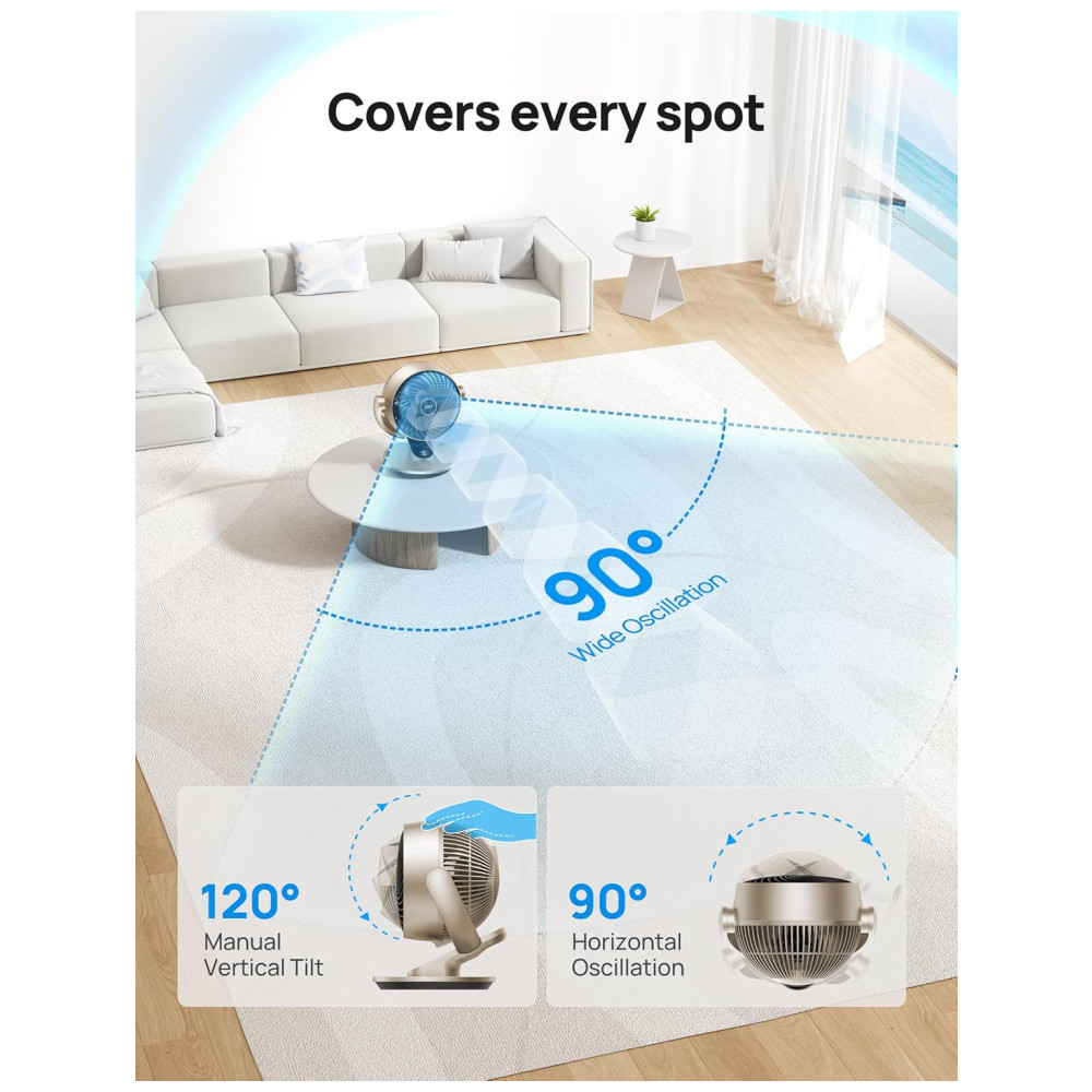 Oscilação 120° Vertical + 90° Horizontal: O ventilador oscila horizontalmente em até 90° e verticalmente em até 120°, removendo o ar viciado de cada canto e melhorando a eficiência de ar-condicionado ou aquecedores, reduzindo assim os custos de energia.