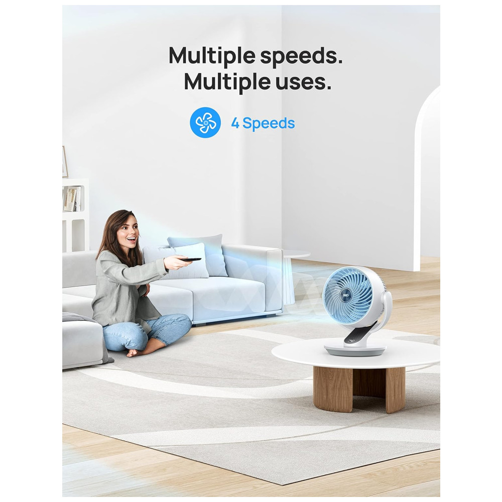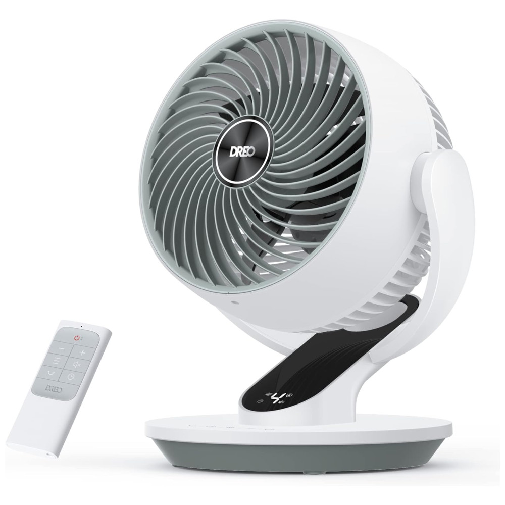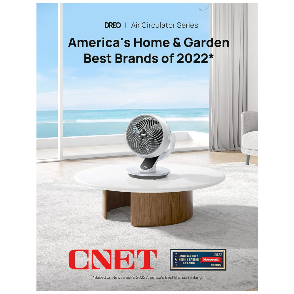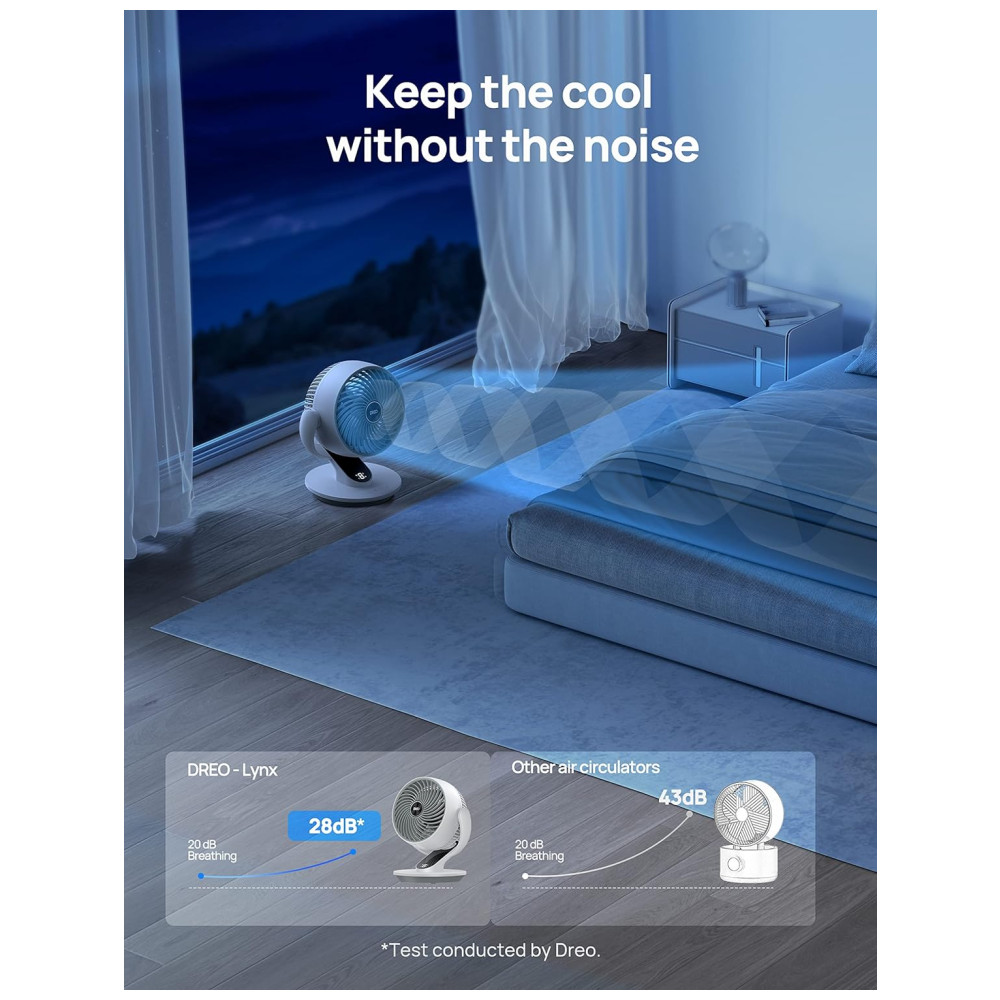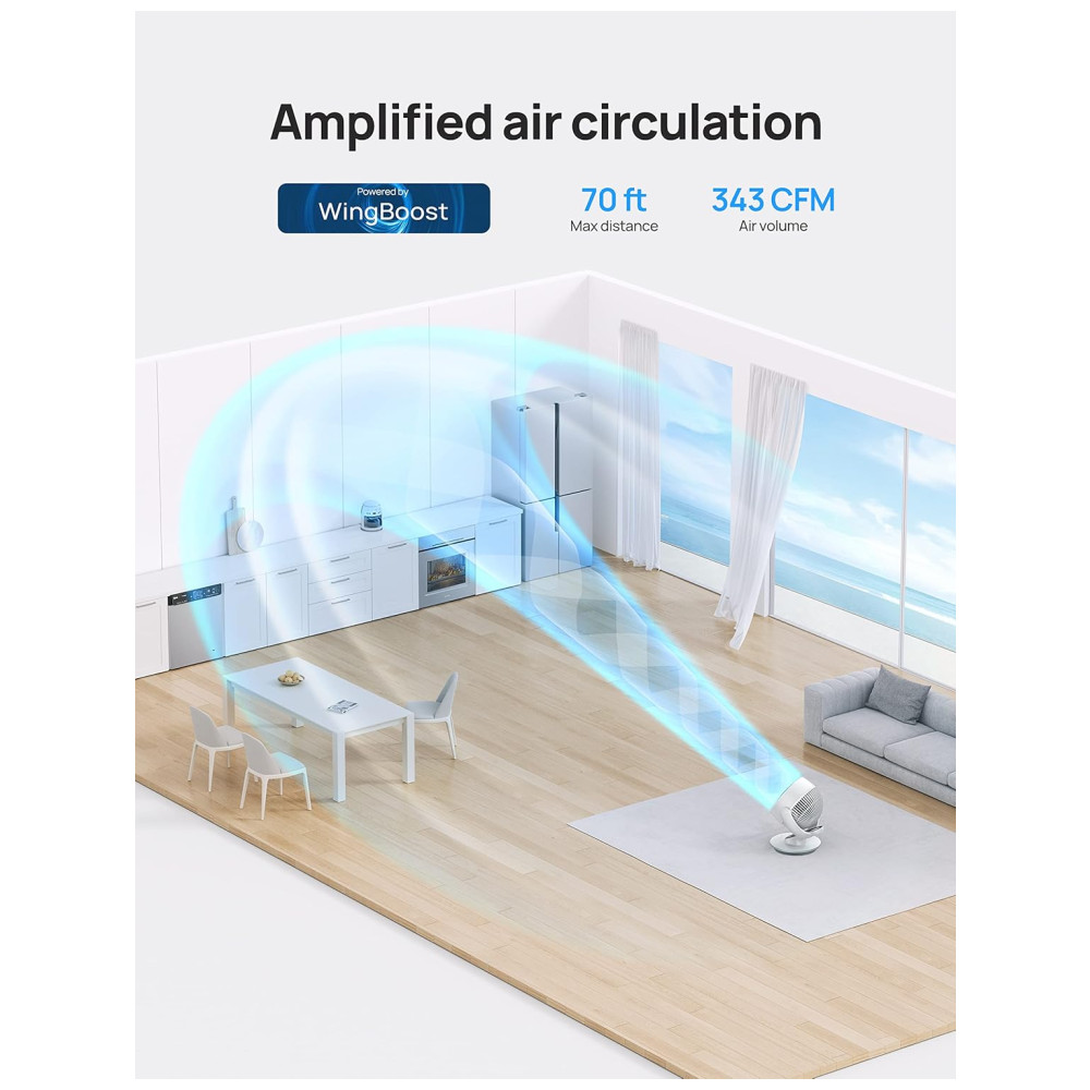 Apresentando o Ventilador Oscilante Dreo para Quarto: um circulador de ar potente que utiliza a tecnologia WingBoost, proporcionando ventos que alcançam até 21 m, com um volume de ar impressionante de 486 m³/h, ideal para mover o ar eficientemente em quartos, salas e escritórios.