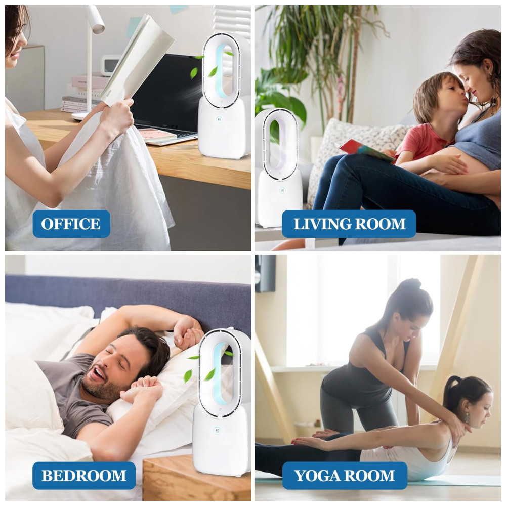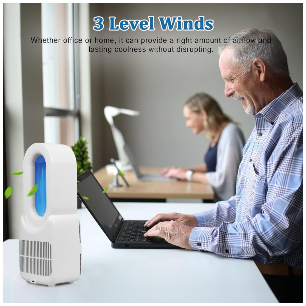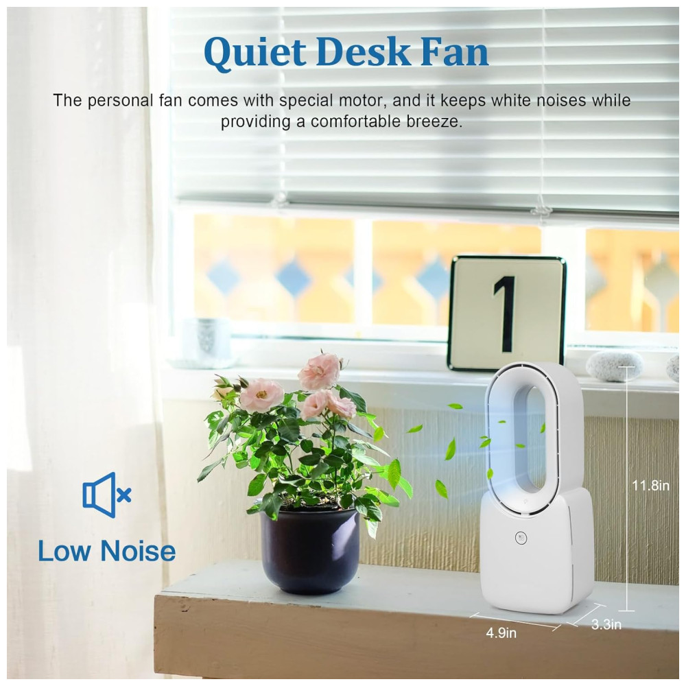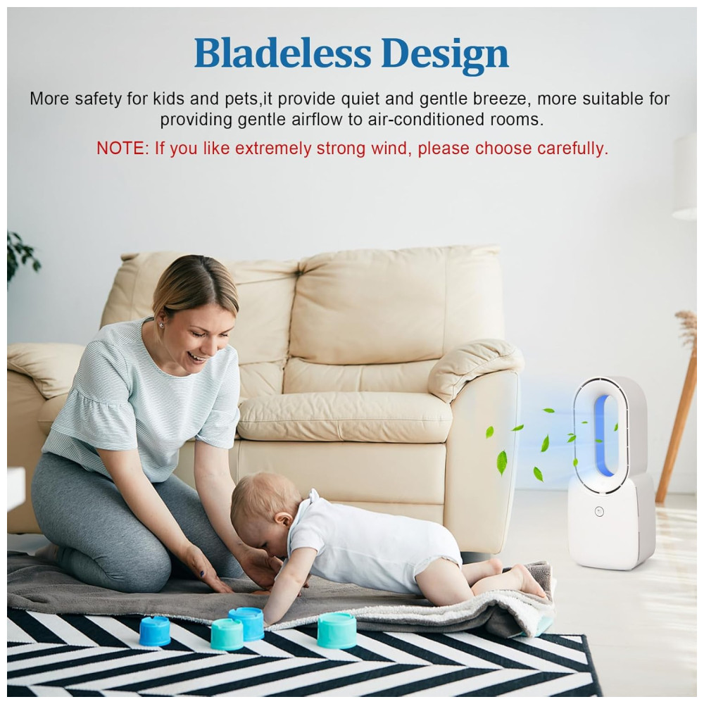 VENTILADOR SEM HÉLICE: Este ventilador pessoal silencioso possui uma grade de entrada de ar segura, aumentando o volume de ar ao soprar uma brisa suave. O design sem hélice garante segurança para bebês, crianças e animais de estimação. Com um duto de vento inclinado, ele proporciona um fluxo de ar fresco e silencioso, perfeito para o quarto ou para a casa.