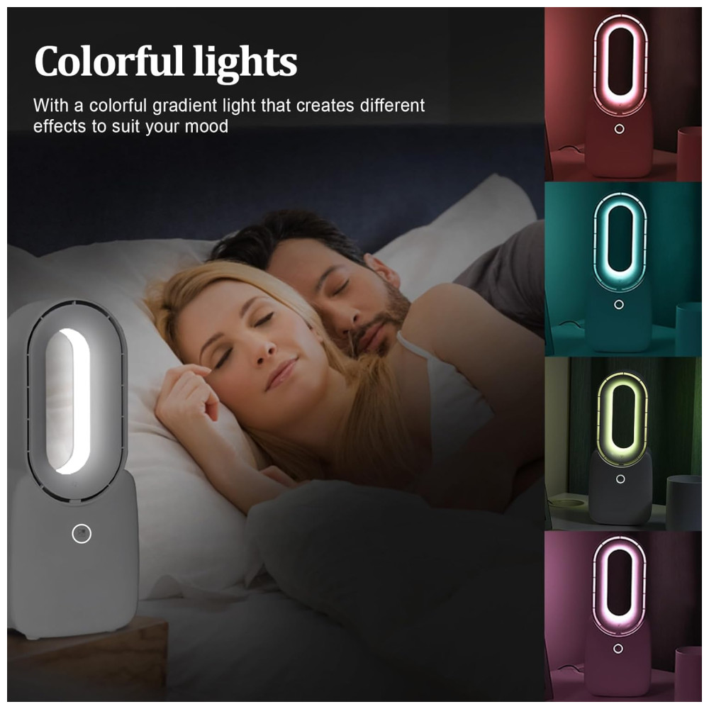 LUZ DECORATIVA LED: Este ventilador de mesa possui luzes LED coloridas em gradiente que criam uma brisa suave e mantêm você longe do ar abafado. À noite, a luz ambiente oferece um ambiente acolhedor e seguro, evitando riscos de acidentes. Base de silicone antiderrapante para maior estabilidade.