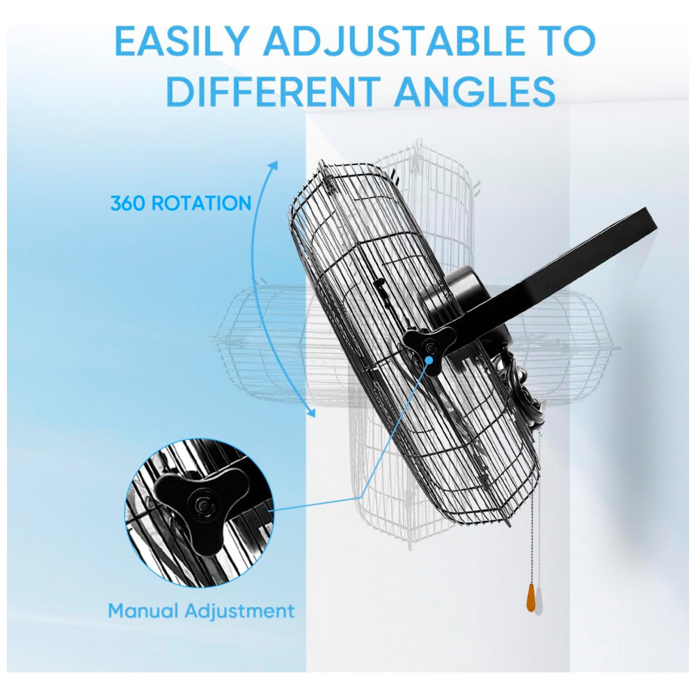 Resfriamento de Área Ampla – Com inclinação ajustável de 360°, este ventilador montado na parede permite direcionar o fluxo de ar de maneira precisa para um resfriamento eficaz.