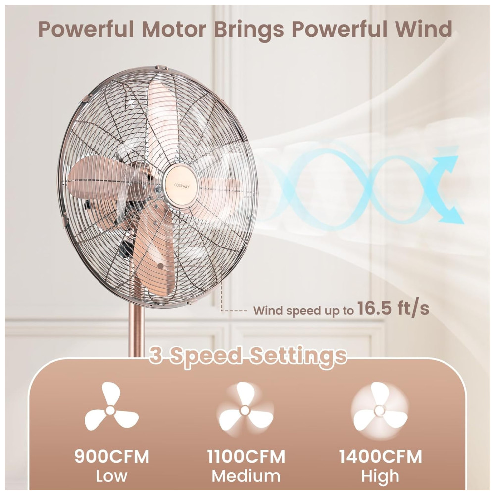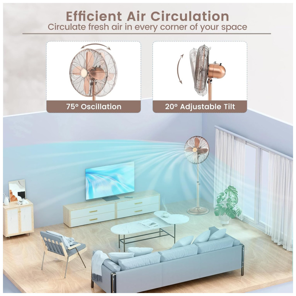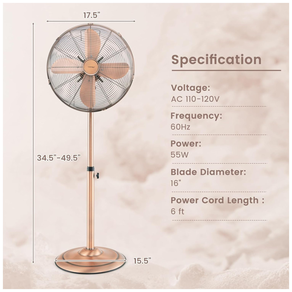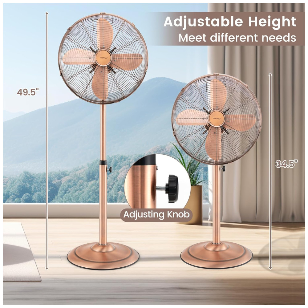 Ventilador de Pedestal Oscilante de Metal Silencioso e Potente com 3 Velocidades e Ajuste de Altura 110V COSTWAY Cobre