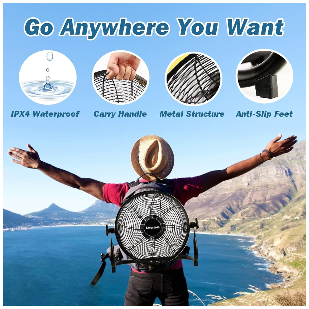 Projetado para Uso Externo Extremo: Com uma estrutura à prova d’água IPX4, esse ventilador é resistente a condições climáticas adversas. Sua estrutura metálica robusta e pés de borracha antiderrapantes suportam impactos e mantêm o ventilador funcionando normalmente em diversos cenários. Totalmente sem fio e com uma alça de transporte, ele é portátil e fácil de levar para qualquer lugar.