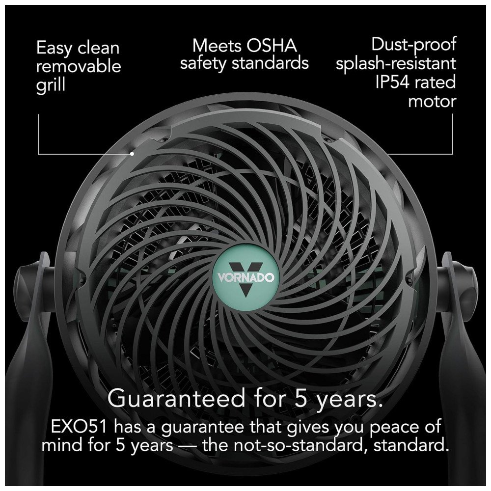 DESEMPENHO ÓTIMO: O EXO51 é o parceiro ideal para o local de trabalho. Utiliza a tecnologia Vortex, assinatura da Vornado, para uma circulação de ar eficiente. Seu corpo quase indestrutível é feito para durar, e os controles de alternância, fáceis de usar com luvas, garantem agilidade no manuseio.
