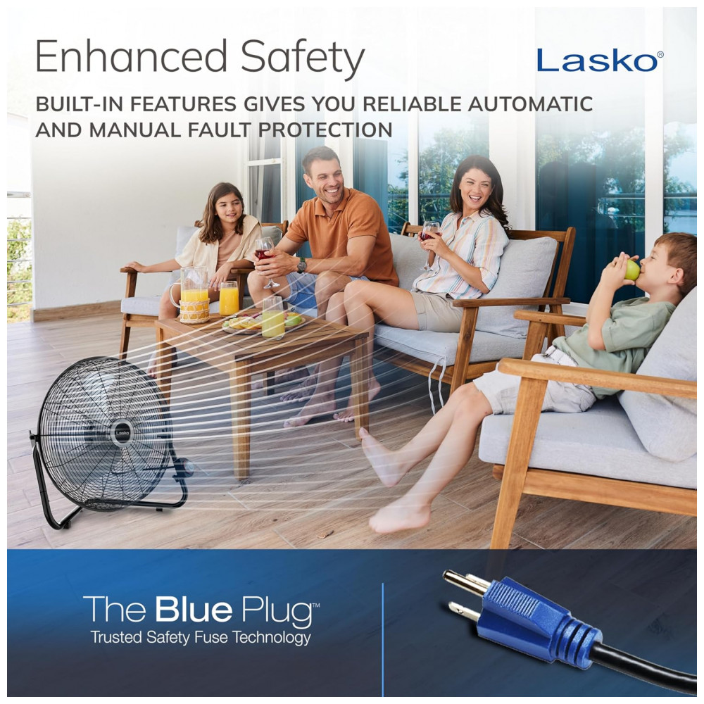 Segurança Prioritária: Com foco na sua segurança, este ventilador elétrico possui certificação ETL e a tecnologia de fusível de segurança da Lasko, além do THE BLUE Plug, que interrompe automaticamente o funcionamento em caso de falhas elétricas.
