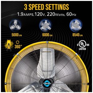 ESPECIFICAÇÕES POTENTES: Cabo de alimentação extra-longo de 2,4 m (SJT-R), consumo de 1,9 ampères, 1100 RPM, capacidade de fluxo de ar de até 242 m³/min, 220 watts, 120V, 60 Hz, motor de 1/3 CV. Possui inclinação total de 360 graus para direcionar o ar onde for necessário. Atende aos padrões de segurança OSHA e UL507, com certificação UL.