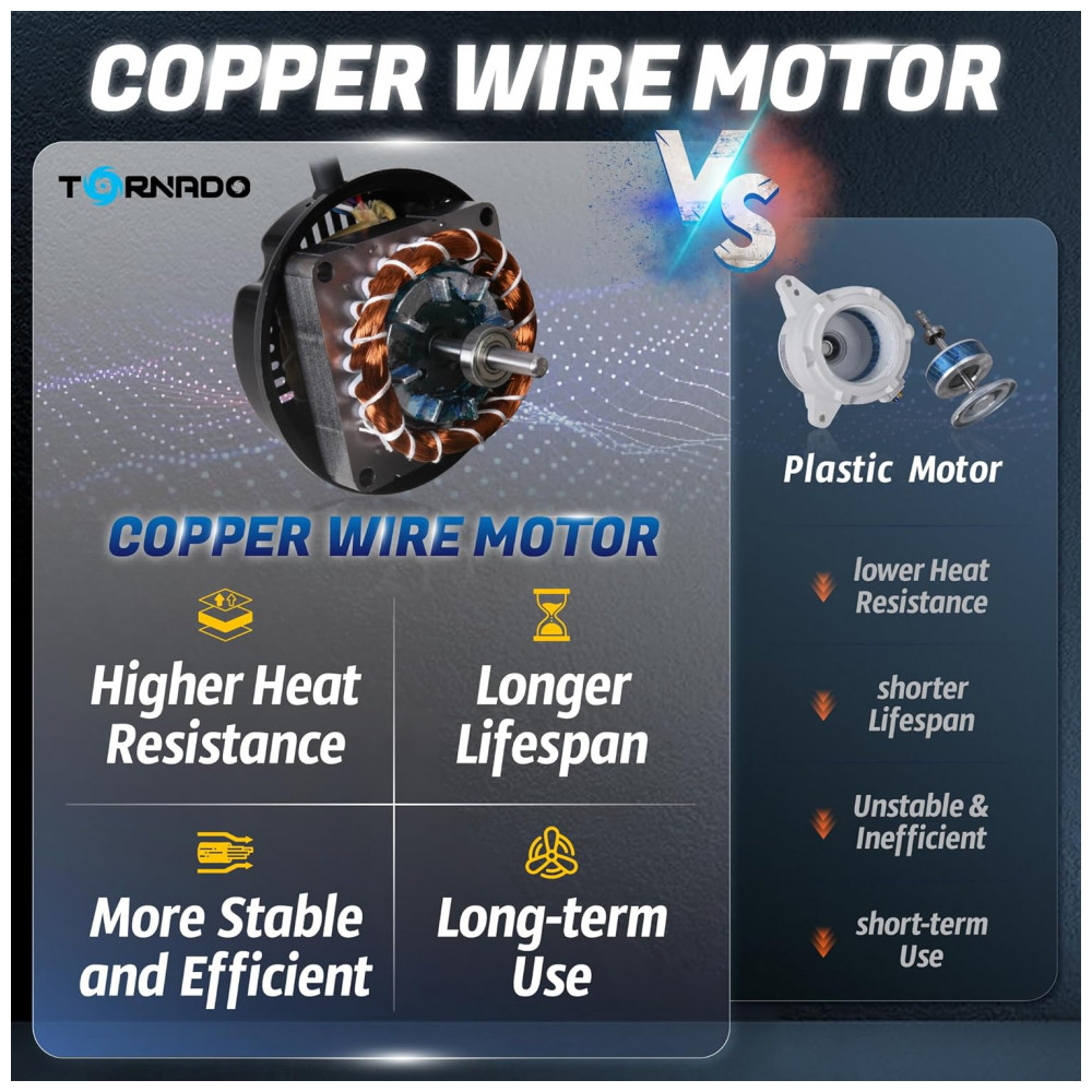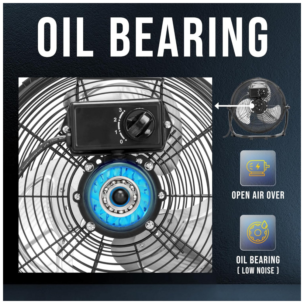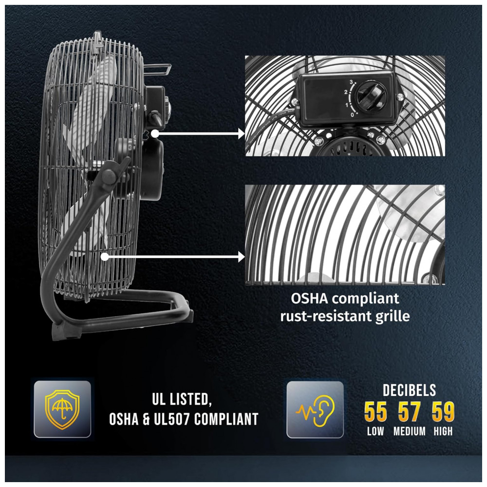 Construído com hélices de alumínio resistentes e estrutura em aço com pintura powder-coated, assegura durabilidade e resistência contra corrosão. O motor com rolamento a óleo opera silenciosamente a 1500 rpm e consome 60 watts, sendo alimentado por 120 volts e certificado UL para segurança.