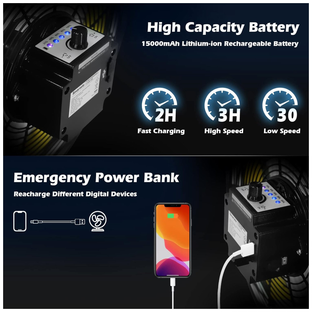 Carregamento Rápido e Função Power Bank: Equipado com uma bateria de lítio de alta qualidade de 12500 mAh, o ventilador Smartele FF-12 carrega totalmente em apenas 2 horas e pode funcionar de 3 a 30 horas, garantindo frescor constante. Além disso, pode ser utilizado como power bank para carregar seus dispositivos móveis, tornando-se o companheiro ideal para acampamentos e aventuras ao ar livre.
