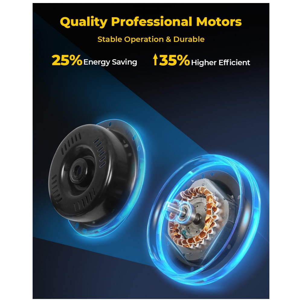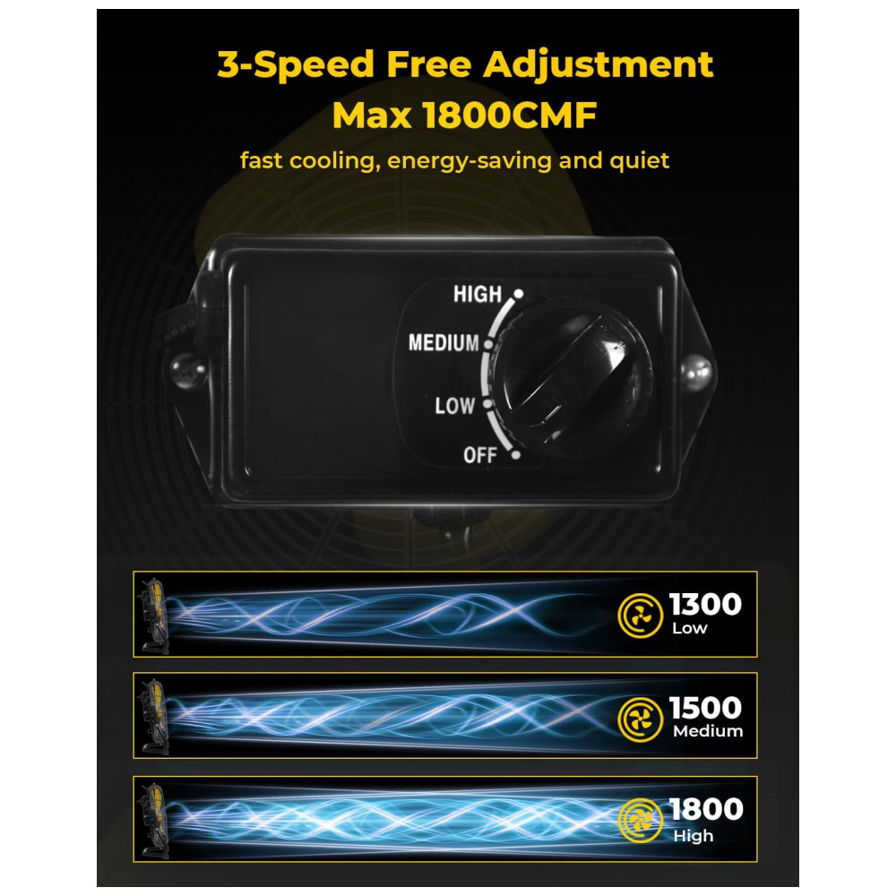 Potente fluxo de ar: Com 3 níveis de controle de velocidade – Alta: 1560 CFM, Média: 1325 CFM, Baixa: 980 CFM – e velocidades de 1100, 1350 e 1550 RPM, este ventilador de alta velocidade proporciona uma brisa refrescante em qualquer situação. A velocidade do vento chega a 8,1 m/s, garantindo o conforto ideal nos dias mais quentes.