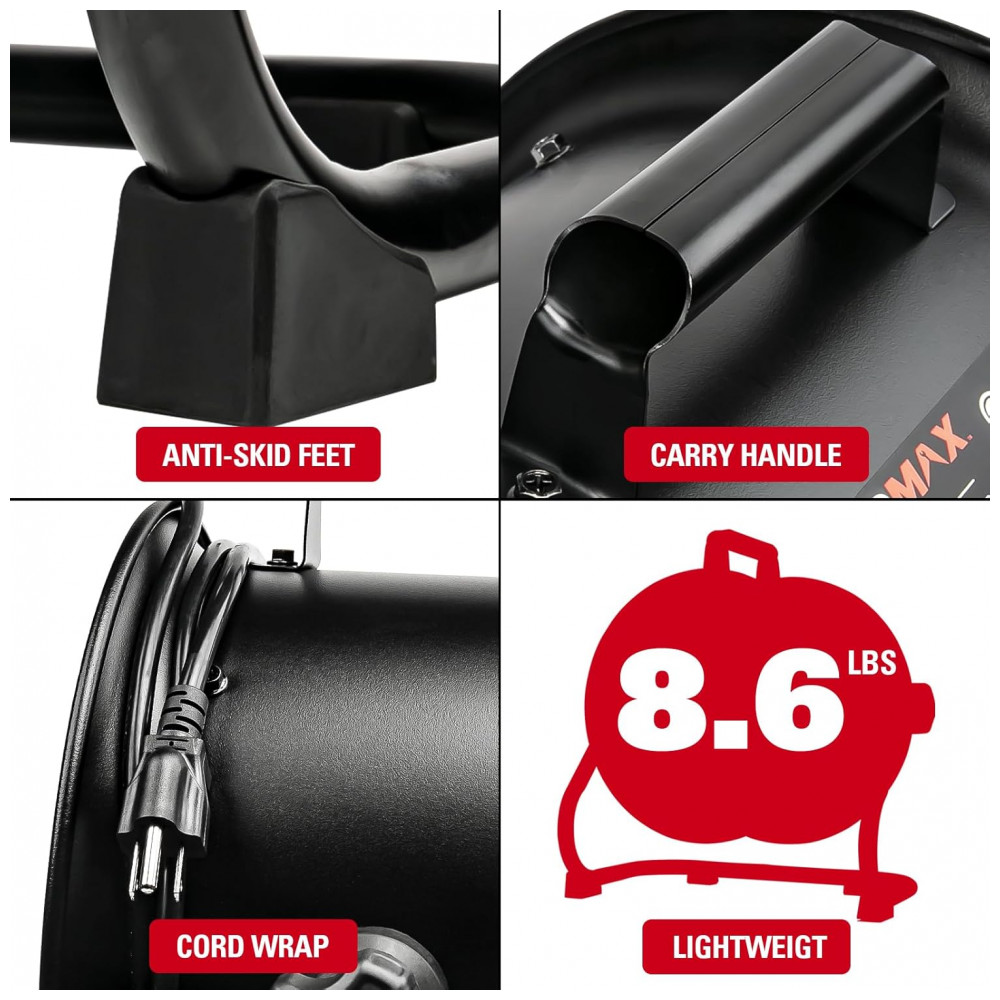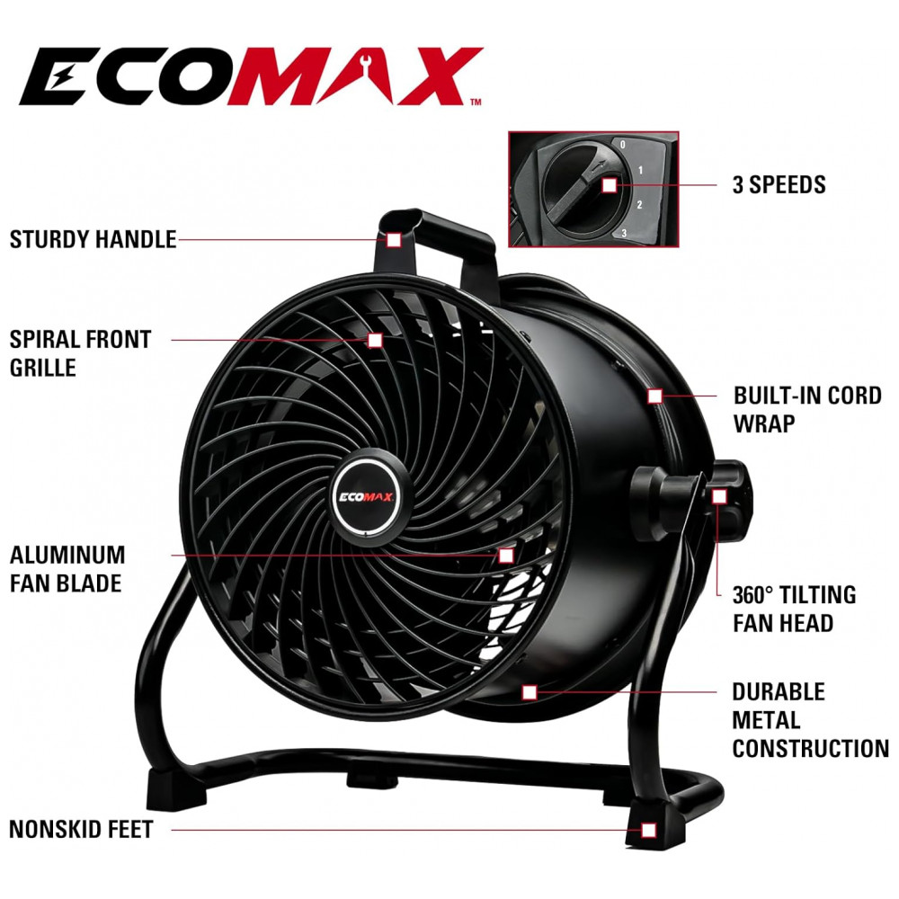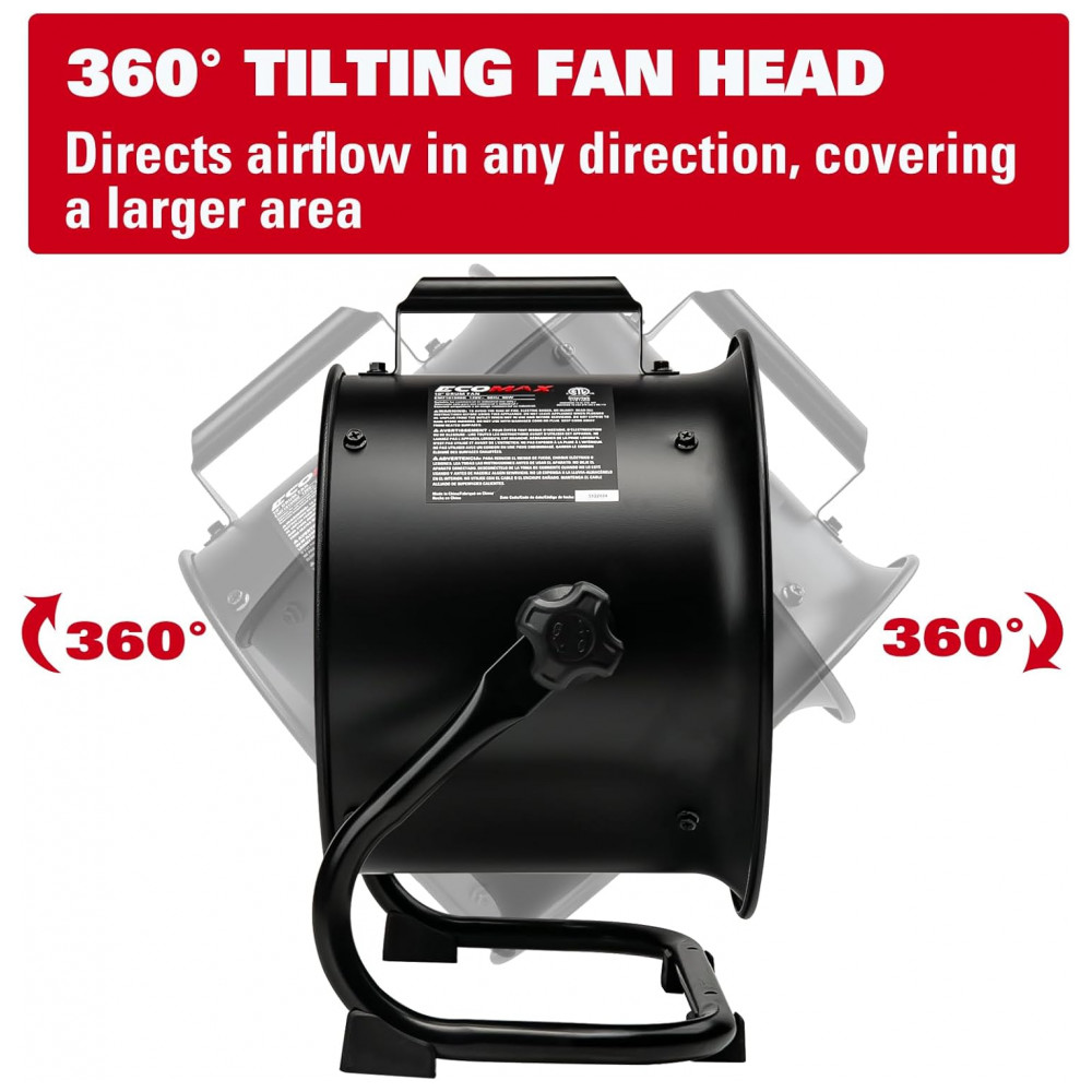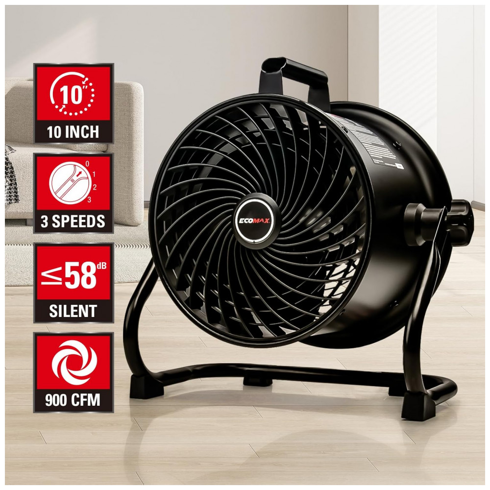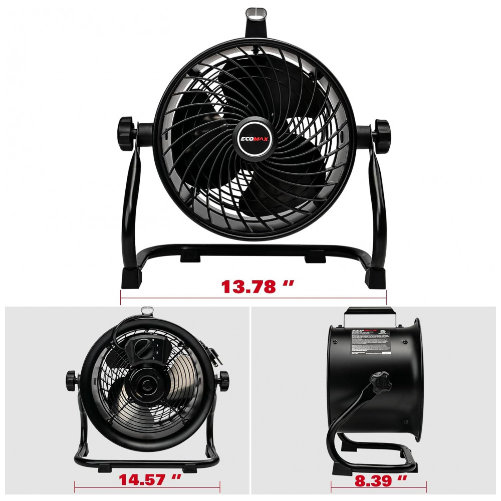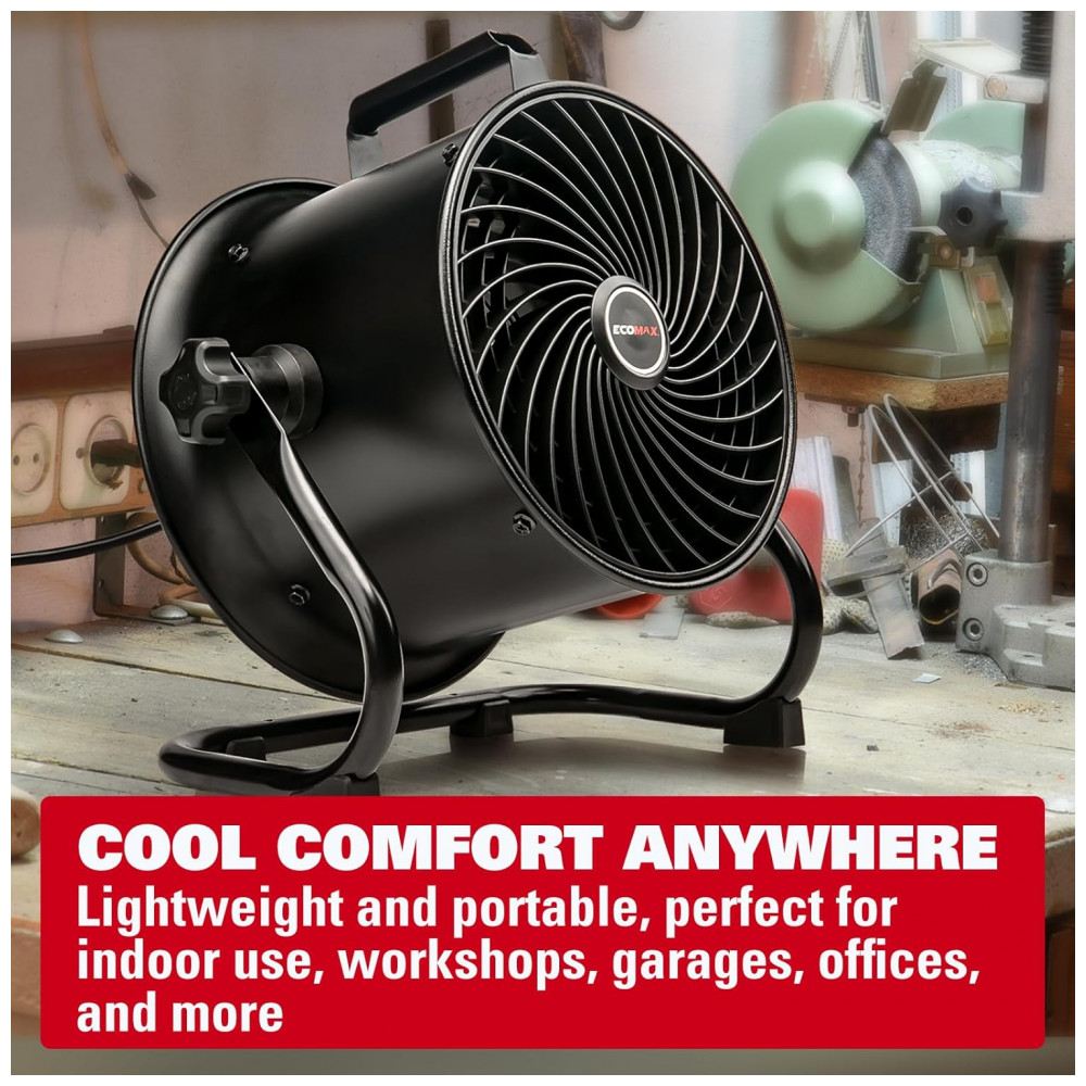 O ventilador de tambor industrial ECOMAX de 25,4 cm oferece alta eficiência na circulação de ar em ambientes industriais, comerciais e residenciais. Equipado com motor robusto de 1/5 Cavalos, proporciona fluxo máximo de 900 CFM (aproximadamente 25,5 metros cúbicos por minuto), assegurando ventilação eficaz em espaços compactos. Possui controle de três velocidades ajustáveis por botão rotativo, facilitando a adaptação do fluxo conforme a necessidade do local. O cabeçote permite inclinação ajustável em 360°, otimizando a direção do fluxo de ar. Construção resistente em metal com pás de alumínio, garantindo durabilidade e desempenho prolongado. Conta com pés antiderrapantes para maior estabilidade durante operação, além de alça para transporte prático e cabo de 2 metros para melhor manejo. Opera em 110 volts, com nível sonoro de 58 decibéis, adequando-se a locais que demandam baixo ruído. Produto certificado UL, adequado para uso interno e externo com alto padrão de segurança e eficiência.