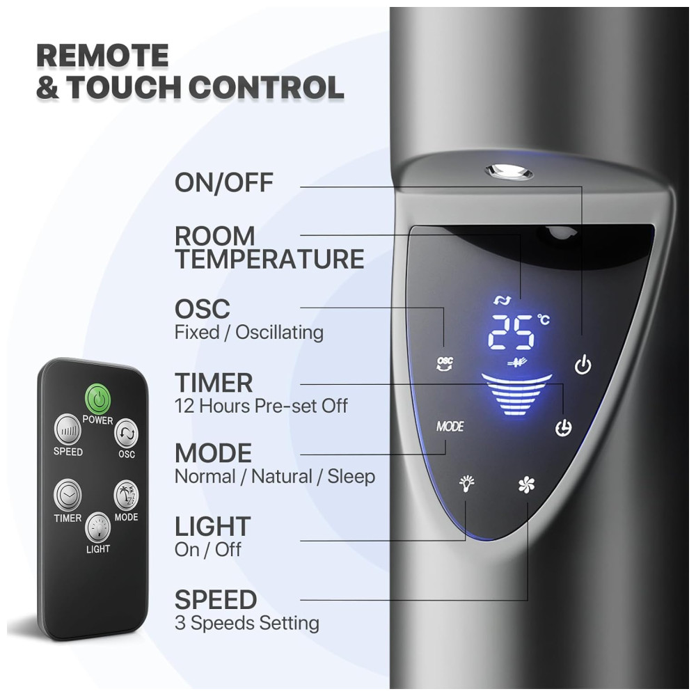 Ventilador de Torre com Controle Remoto 3 Velocidades Temporizador 12H e Tela LED 110V Mollie Cinza