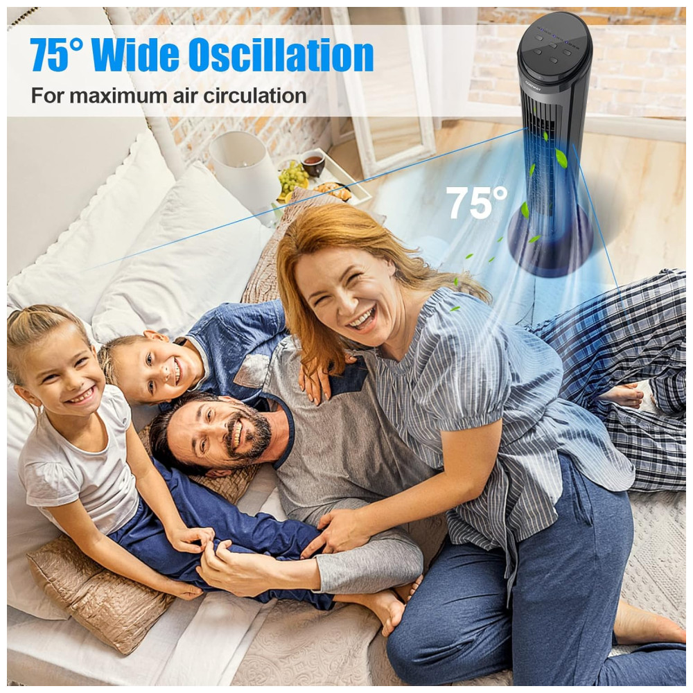 Oscilação Ampla de 75°: Com uma oscilação de 75°, este ventilador torre poderoso oferece um fluxo contínuo de ar fresco, promovendo a circulação eficiente do ar no ambiente e mantendo você confortável nos dias quentes. Ele também é o companheiro ideal para o ar-condicionado, ajudando a economizar energia e a resfriar o espaço de maneira mais eficaz.