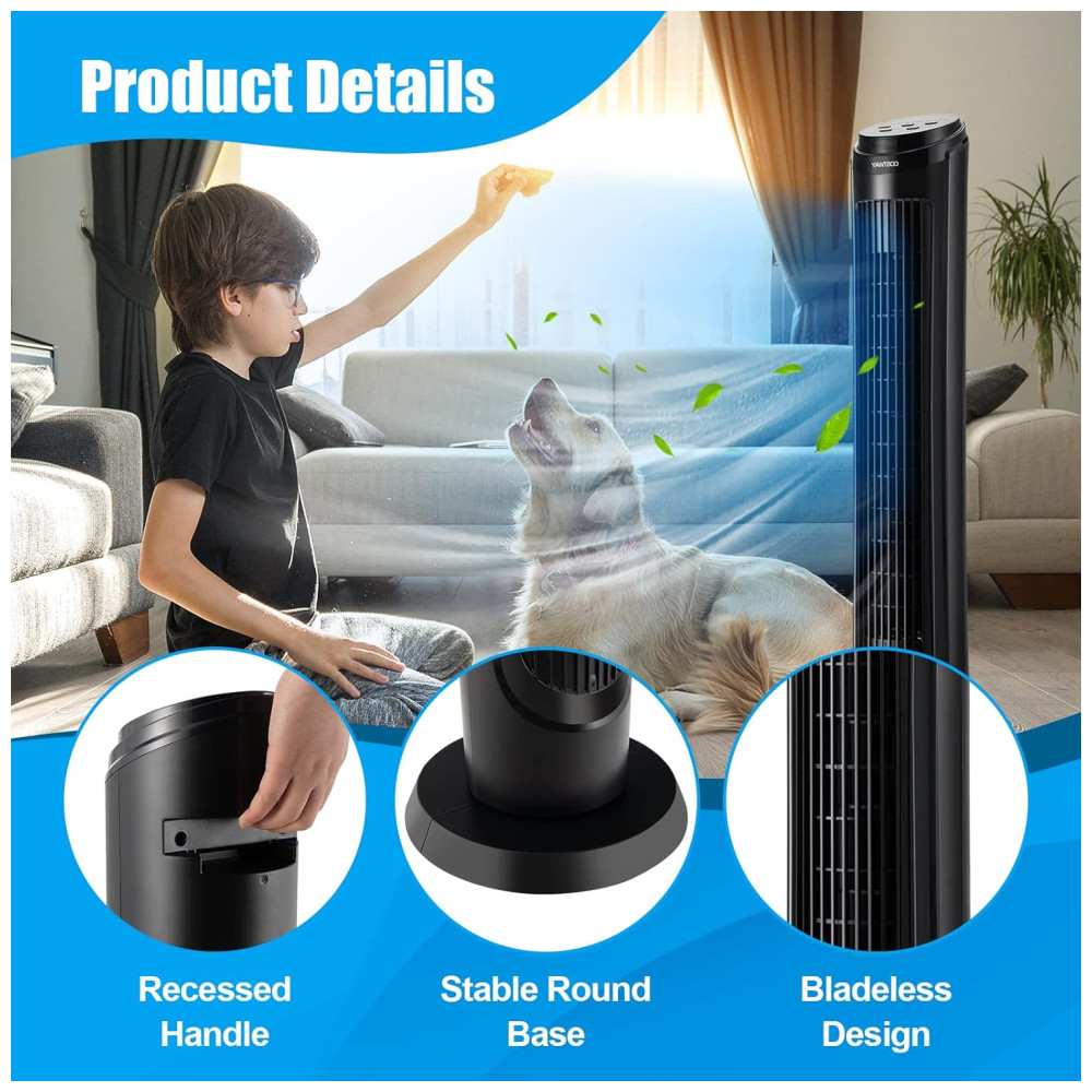 Estrutura Segura e Aplicação Versátil: O design sem hélices e a base redonda estável garantem segurança e estabilidade, tornando-o ideal para lares com crianças. Com um design compacto e que economiza espaço, este ventilador torre se encaixa facilmente nos cantos do ambiente, sendo perfeito para uso em casa ou no escritório. A alça embutida facilita o transporte do ventilador.