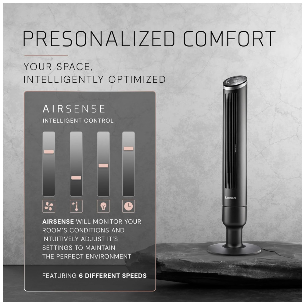 Equipado com a tecnologia AIrsense da Lasko, o ventilador detecta automaticamente a temperatura ambiente e ajusta as velocidades para criar o ambiente perfeito, adaptado às suas necessidades. Oferece 6 velocidades e 4 modos de vento exclusivos, incluindo o modo Personalizado com mais de 1.152 configurações possíveis, permitindo uma experiência de conforto totalmente ajustada.