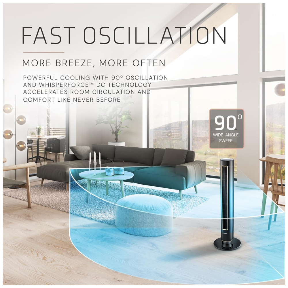 Ventilador de Torre com Controle Remoto Distância Máxima do Ar 9 Metros 12 Velocidades Temporizador de 24H Luz Noturna 110V 36W Lasko DST100 Preto