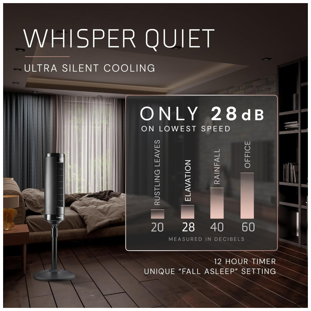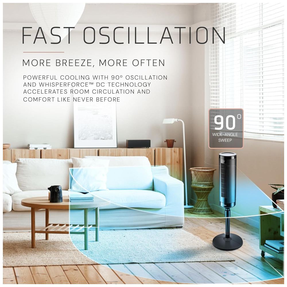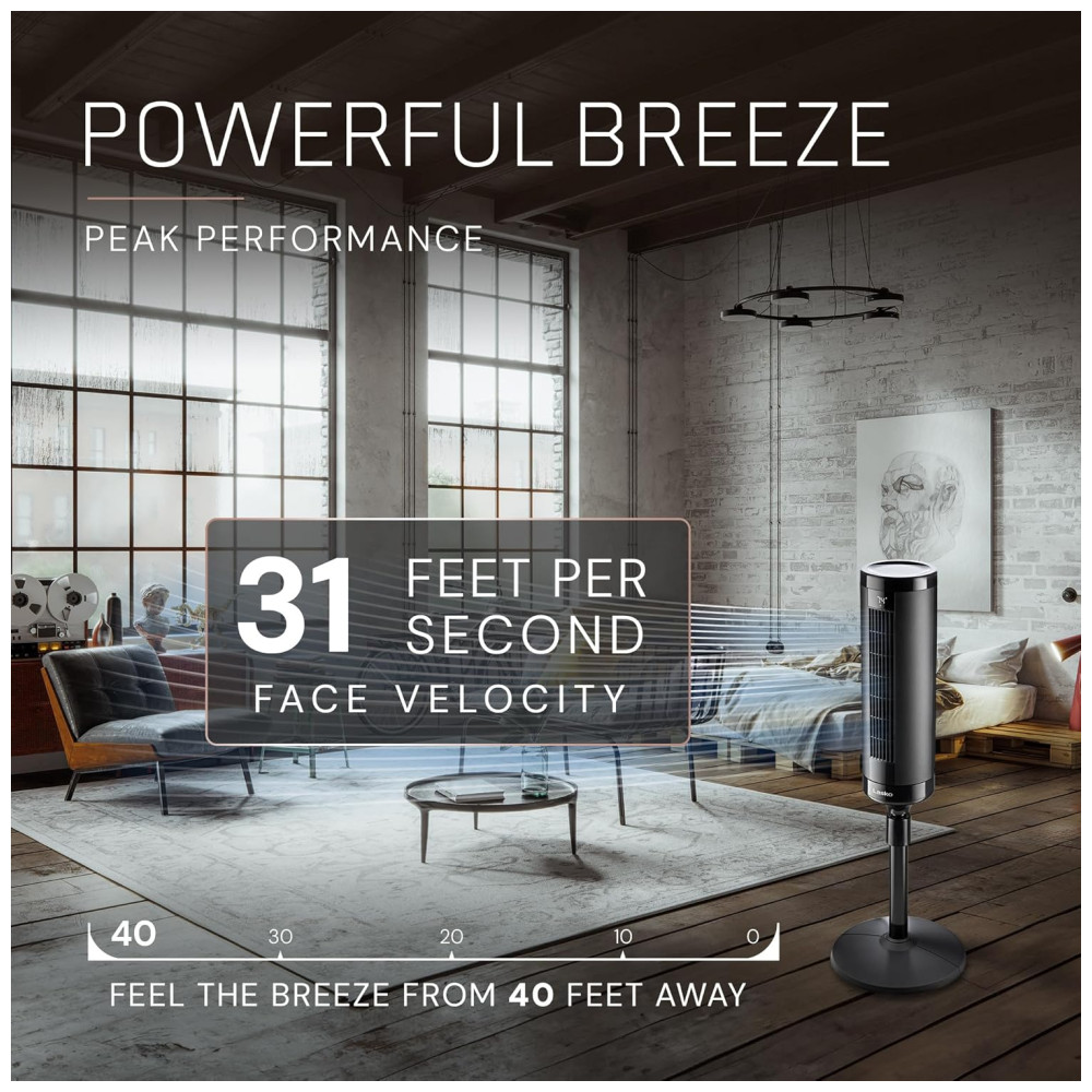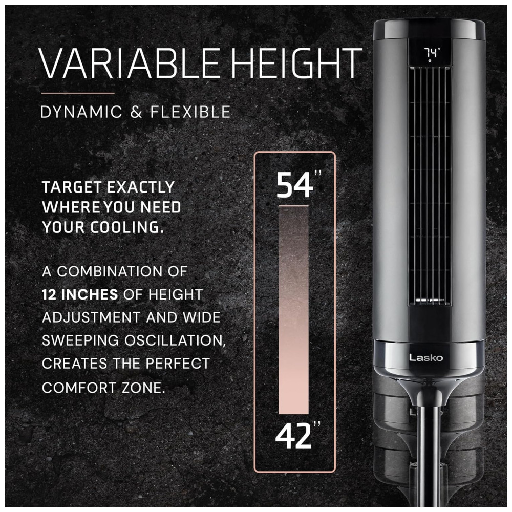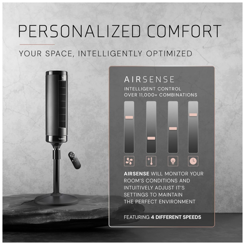 Eleve o conforto do ar interno a novos patamares com o ventilador de torre oscilante de pedestal Lasko Elevation na elegante cor preta. Equipado com a inovadora tecnologia de autoaprendizagem AIrsense da Lasko, este ventilador adapta-se intuitivamente ao seu ambiente, ajustando seus recursos com base na temperatura e em suas preferências pessoais para uma experiência personalizada sem esforço.