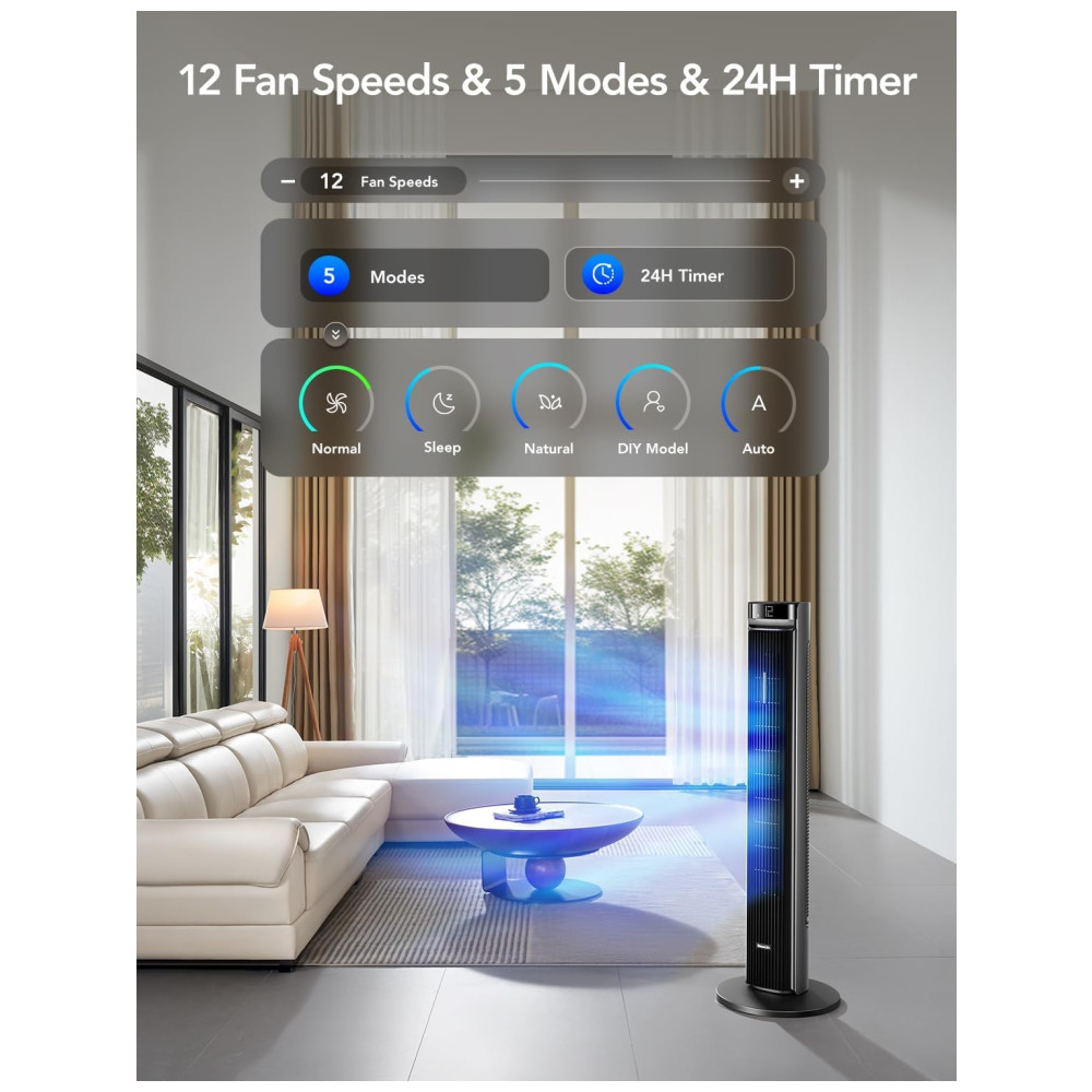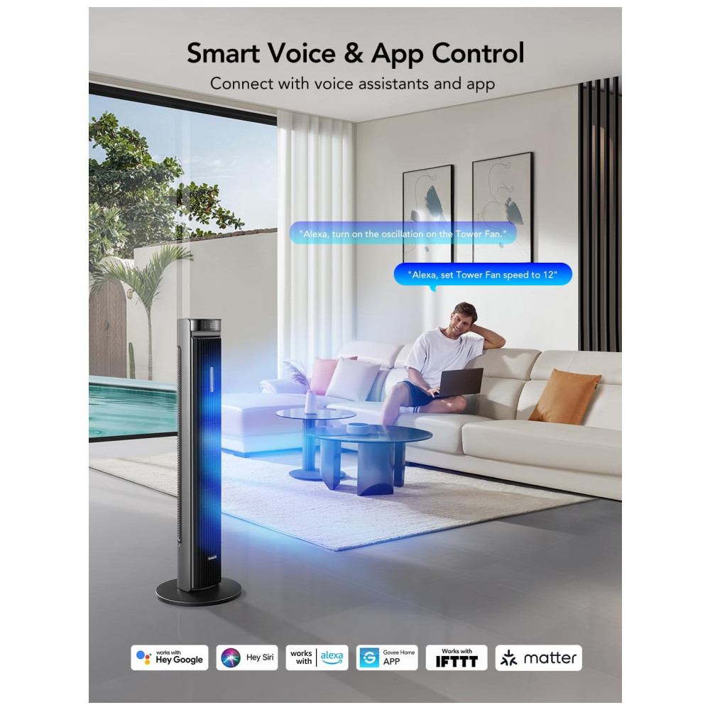 Ventilador de Torre Estilo Moderno com Temporizador de 24H Silencioso 5 Modos 12 Velocidades e Controle por APP ou Voz 110V 48W Goveelife Cinza