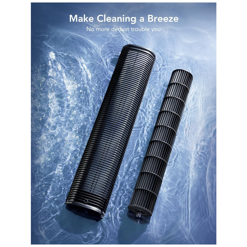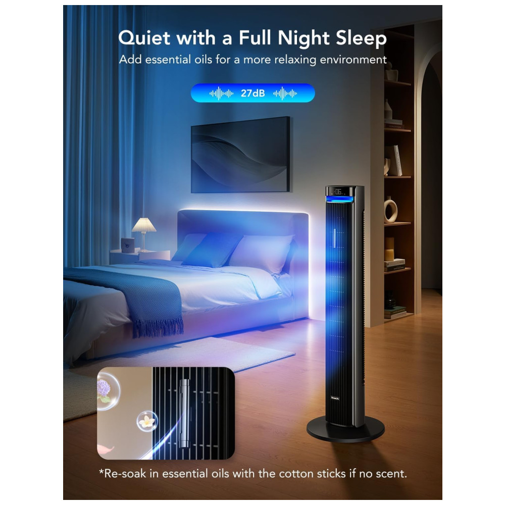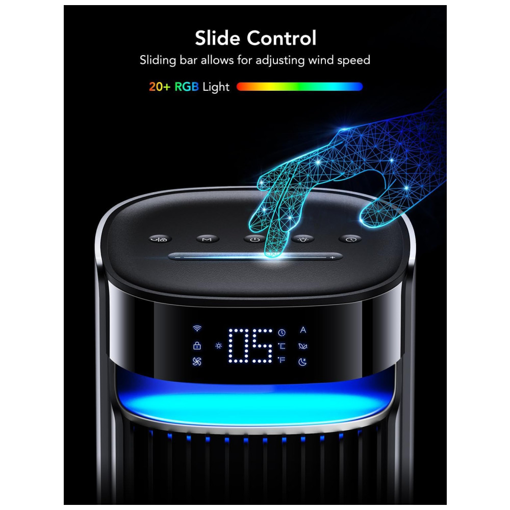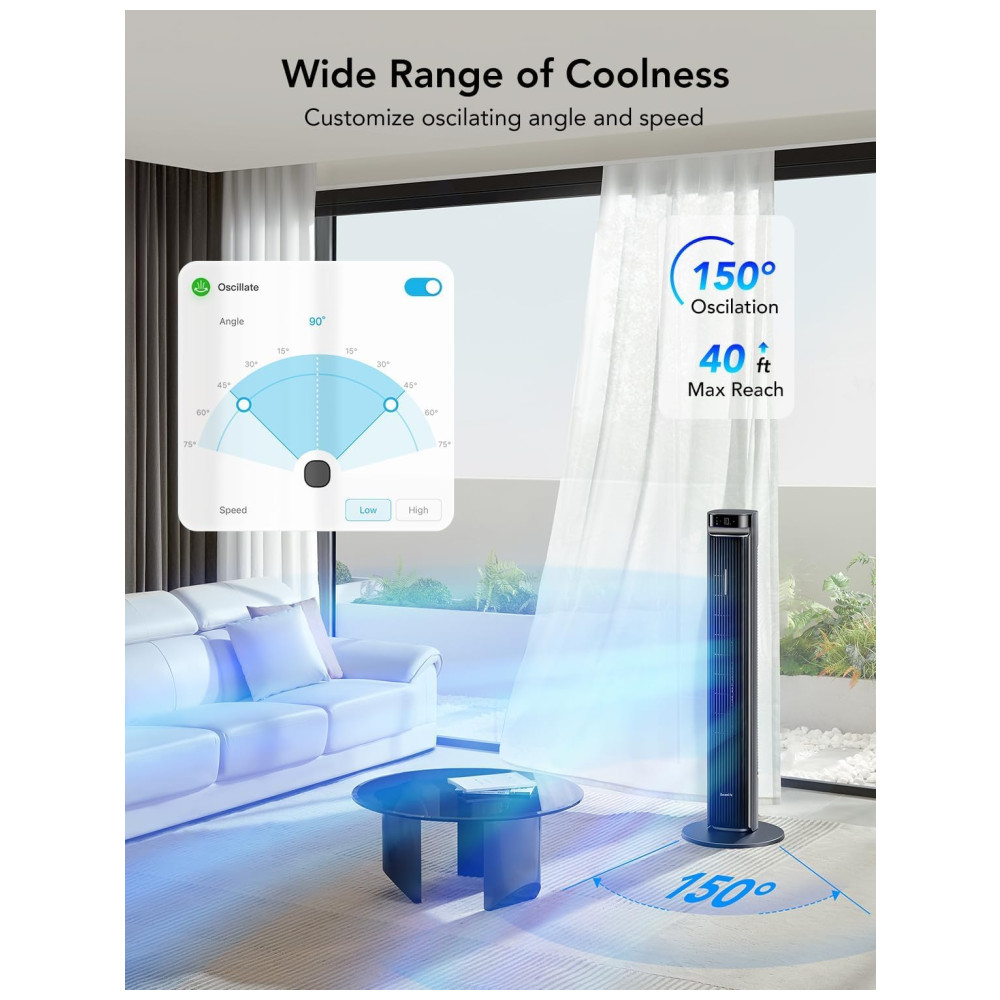 Este ventilador de torre inteligente oferece uma experiência de resfriamento avançada e conectividade moderna. Ele pode ser integrado ao seu sistema de automação residencial através de um aplicativo, sendo compatível com Alexa, Google Assistant e Siri para controle por voz.