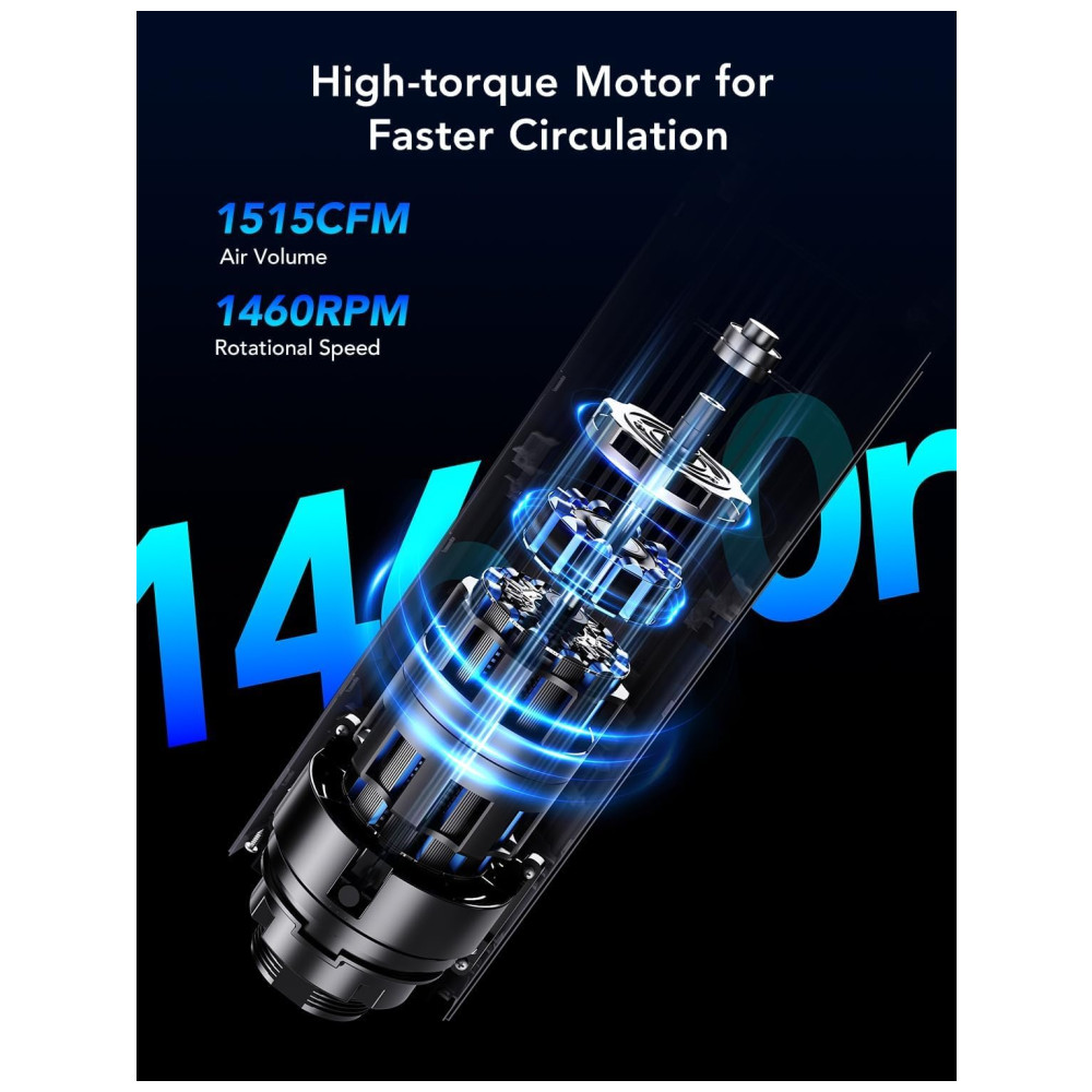 Com 12 velocidades de vento e 5 modos diferentes, este ventilador proporciona um resfriamento eficiente, alcançando ventos de até 7 metros. Ele conta com uma oscilação simétrica ajustável de 30 a 150 graus, permitindo uma ampla distribuição do ar. Equipado com um sensor integrado, o ventilador suporta funções básicas de termostato e pode ser emparelhado com um higrômetro GoveeLife para monitorar continuamente a temperatura do ambiente e ajustar a velocidade do ventilador de acordo com cálculos científicos para um conforto ideal.