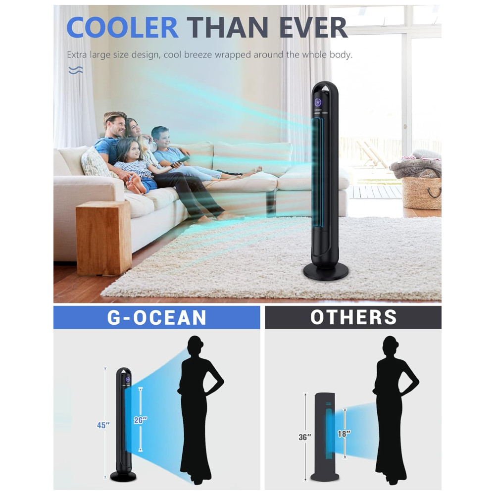 Transforme seu espaço em um ambiente fresco e agradável com o Ventilador Torre G-Ocean, combinando eficiência, segurança e um design moderno para o seu dia a dia!