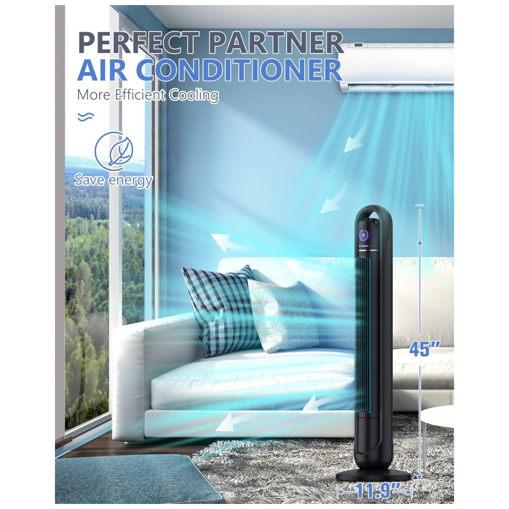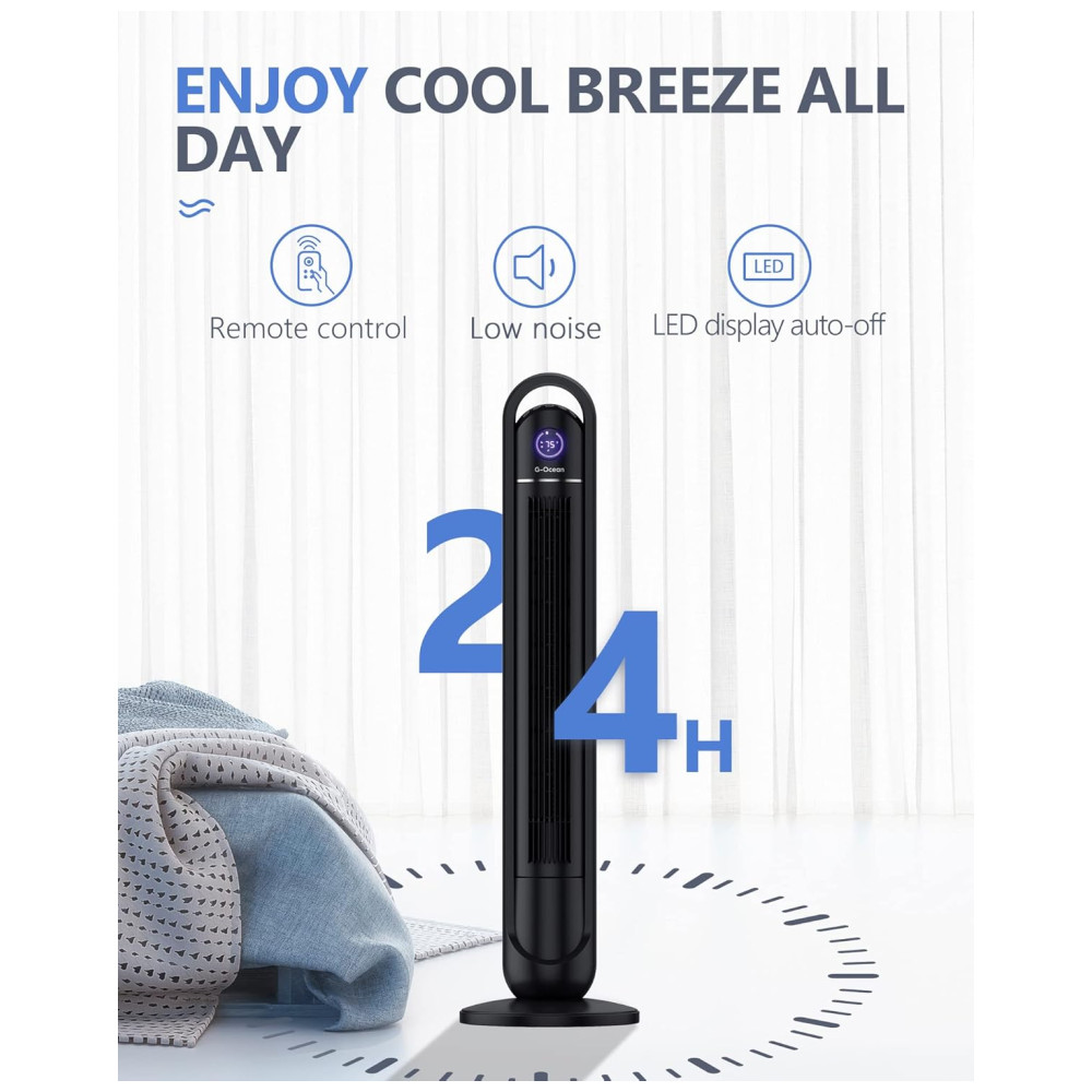 G-Ocean, Seu Companheiro de Resfriamento de Ar: Com uma grade de proteção, o design sem hélice também torna este ventilador torre seguro para crianças, evitando que dedos curiosos entrem em contato com as lâminas. O ventilador torre, certificado pela ETL, possui um plugue de segurança para prevenir sobrecargas de voltagem e danos ao aparelho.
