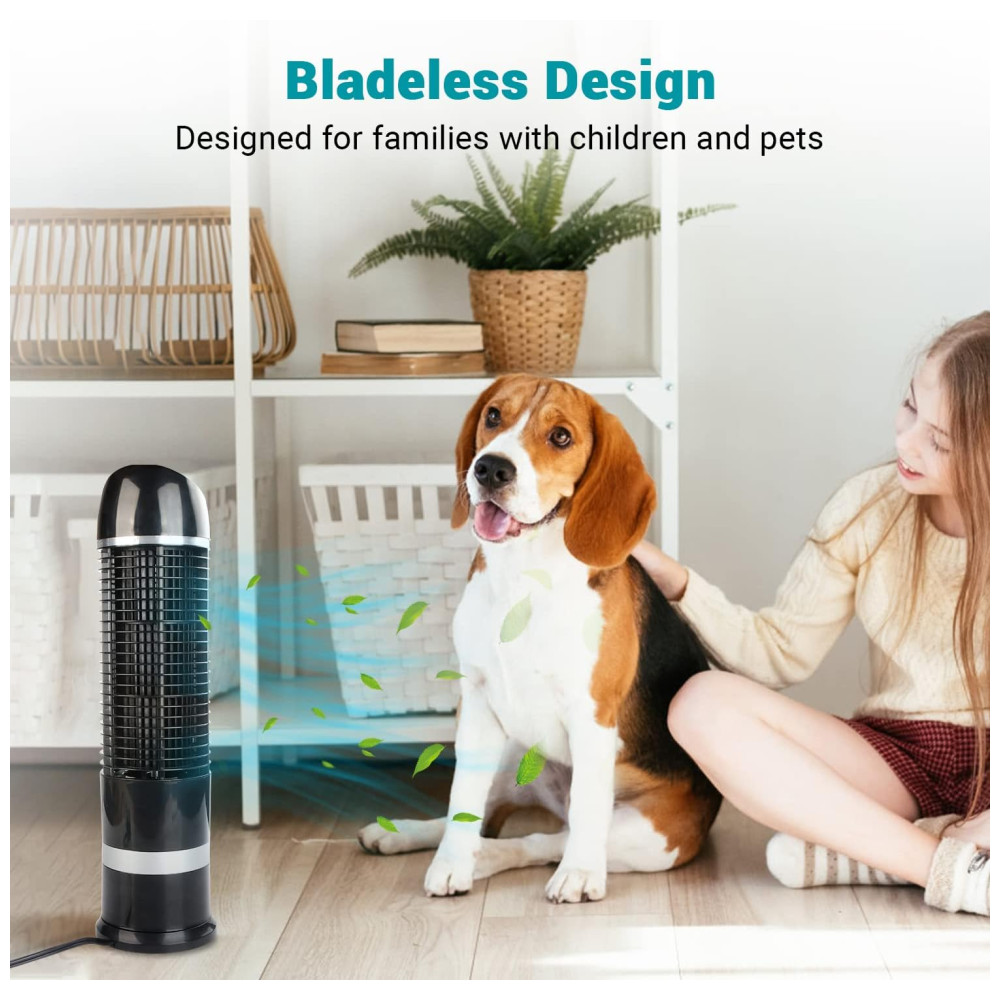Seguro para Crianças e Animais de Estimação: Proporcionando um fluxo de ar refrescante sem lâminas giratórias, este ventilador de mesa é um item essencial para o verão em lares com crianças e pets. Além disso, a grade de segurança externa oferece proteção adicional contra dedos curiosos ou patas.