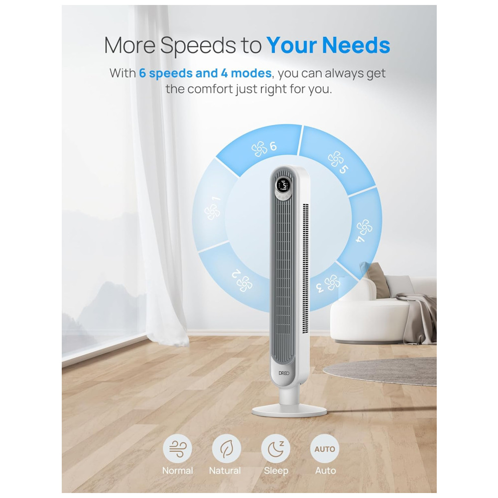 Com uma oscilação de 90 graus, o ventilador oferece uma cobertura ampla, aumentando a circulação de ar interna. São 6 velocidades e 4 modos – Normal, Natural, Sono e Automático – para que você possa ajustar a brisa de acordo com sua preferência e se manter fresco durante os dias quentes de verão, seja no quarto, escritório ou sala de estar.