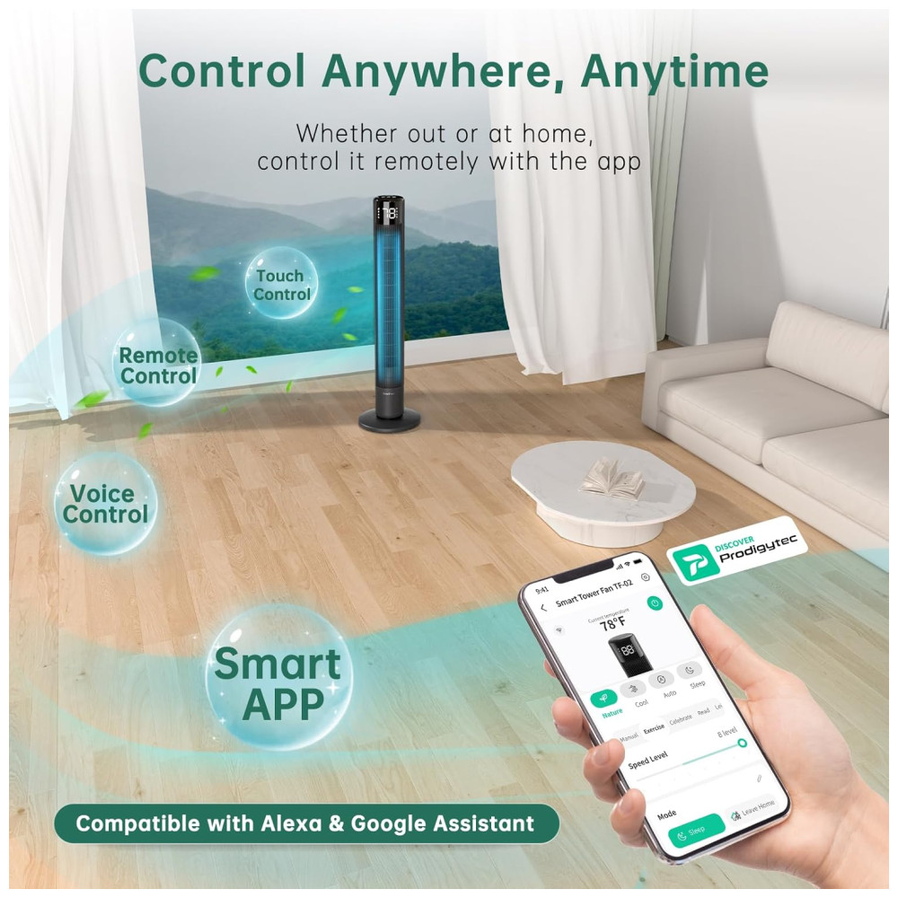 O controle inteligente através do aplicativo permite gerenciar o ventilador facilmente pelo painel de controle, controle remoto ou até mesmo conectando-o a outros dispositivos inteligentes. Você pode ajustar as configurações conforme sua necessidade usando quatro modos de operação: Natural, Gelado, Automático e Sleep.