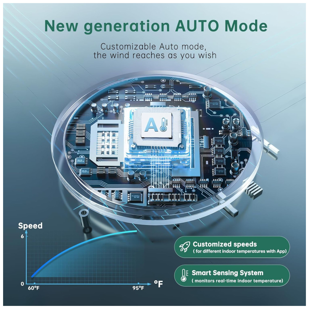 O controle do ventilador é facilitado por um painel intuitivo, controle remoto ou o próprio aplicativo. Com 4 modos de operação — Natureza, Gelado, Automático e Suspensão — ele se adapta a diferentes necessidades e ocasiões.