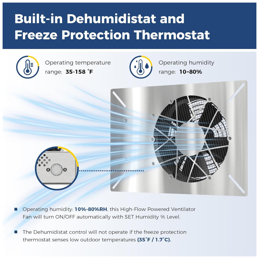 Antes da instalação, meça o tamanho da ventilação do espaço rasteiro. O ventilador pode ser instalado em porões, sótãos, garagens e outros ambientes úmidos. A placa frontal pode ser ajustada para se adequar a aberturas de fundações não padronizadas. Basta conectá-lo, ajustar as configurações e esquecer!