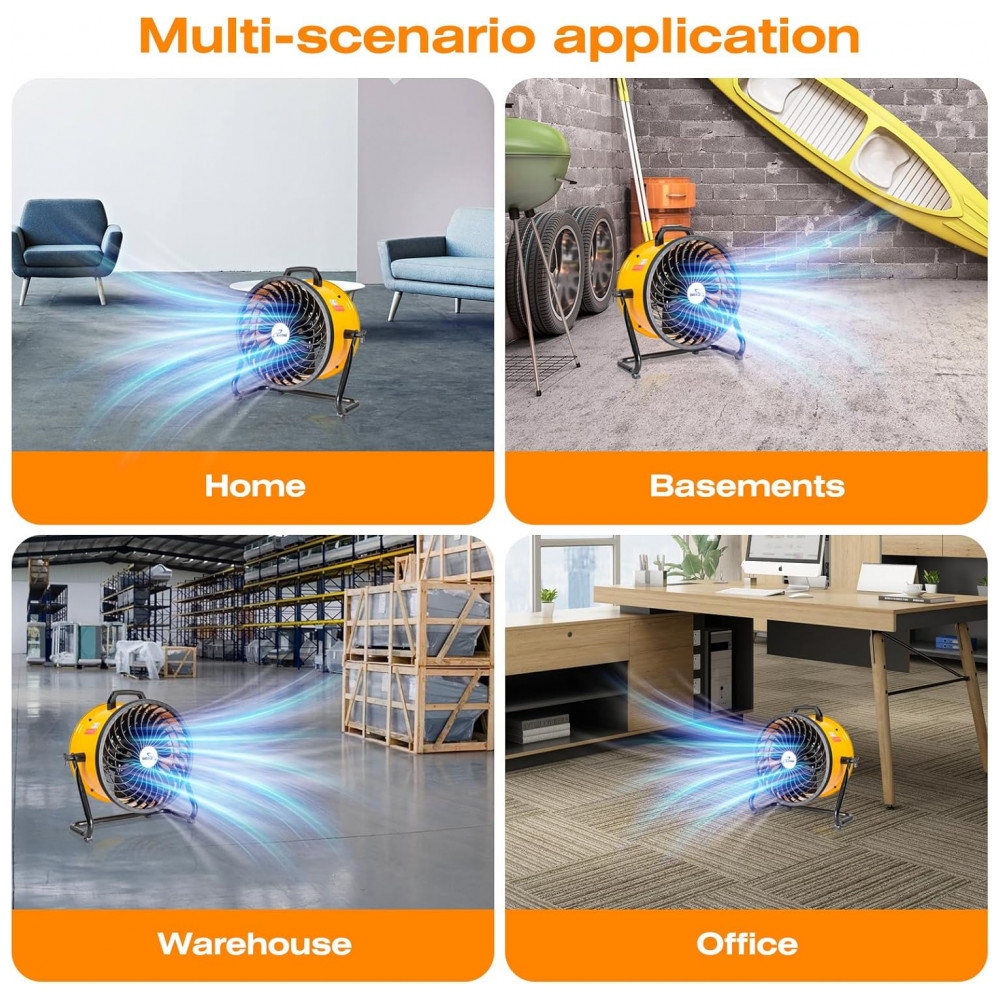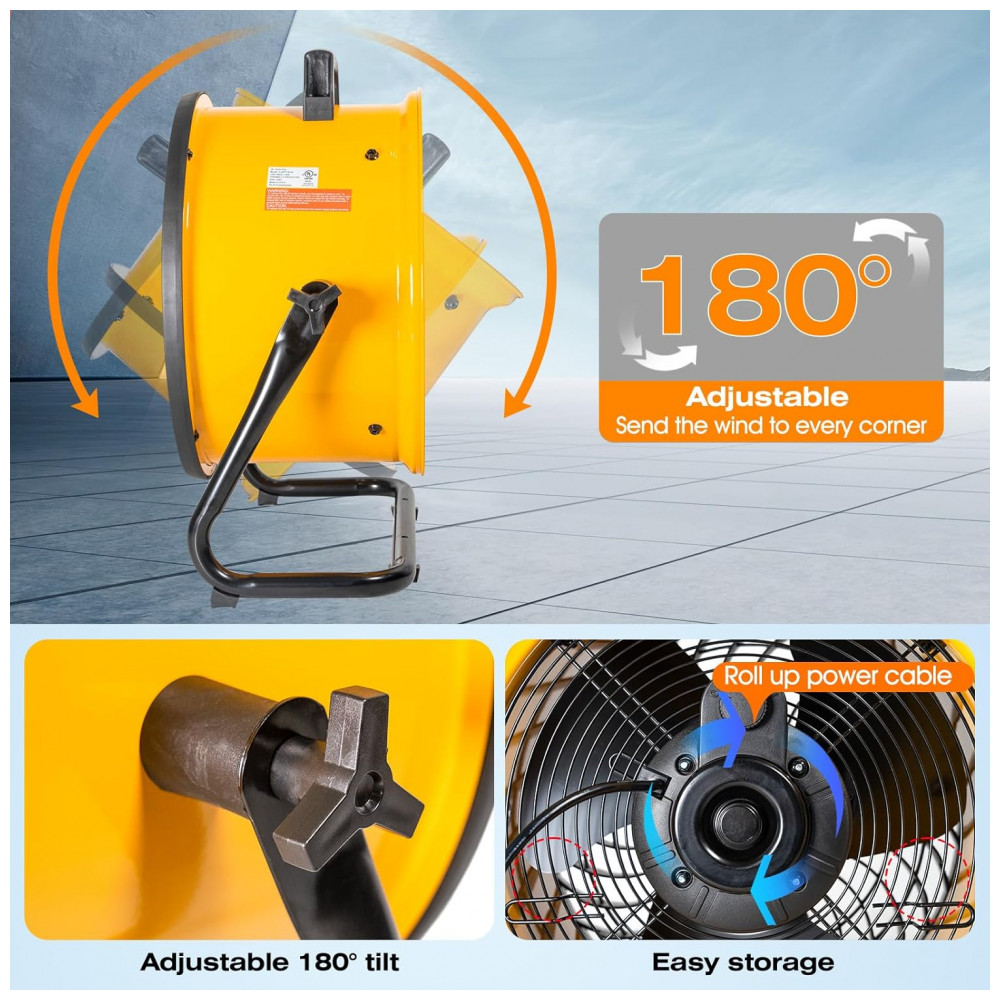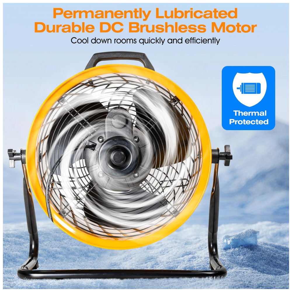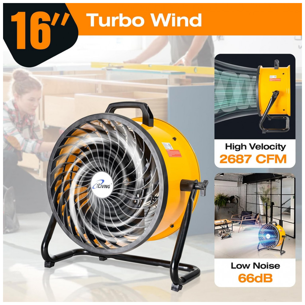 O ventilador turbo iLiving ILG8TF16-DC de 16 polegadas (39,7 cm) entrega alto desempenho com vazão de ar de aproximadamente 2687 pés cúbicos por minuto (cerca de 76,1 m³/min), ideal para circulação de ar em ambientes residenciais e comerciais como escritórios, garagens, estufas e depósitos.