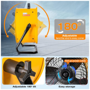 A inclinação ajustável em até 180° facilita a direção do fluxo de ar, e o ventilador pode ser posicionado tanto no piso quanto montado na parede, otimizando o espaço conforme a necessidade do ambiente. O dispositivo possui baixo nível de ruído, operando em até 69 decibéis para maior conforto acústico.