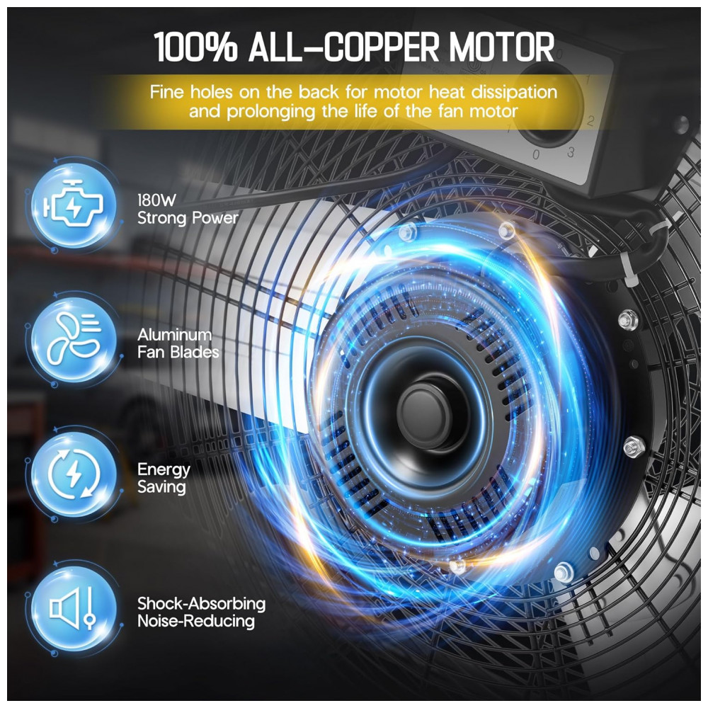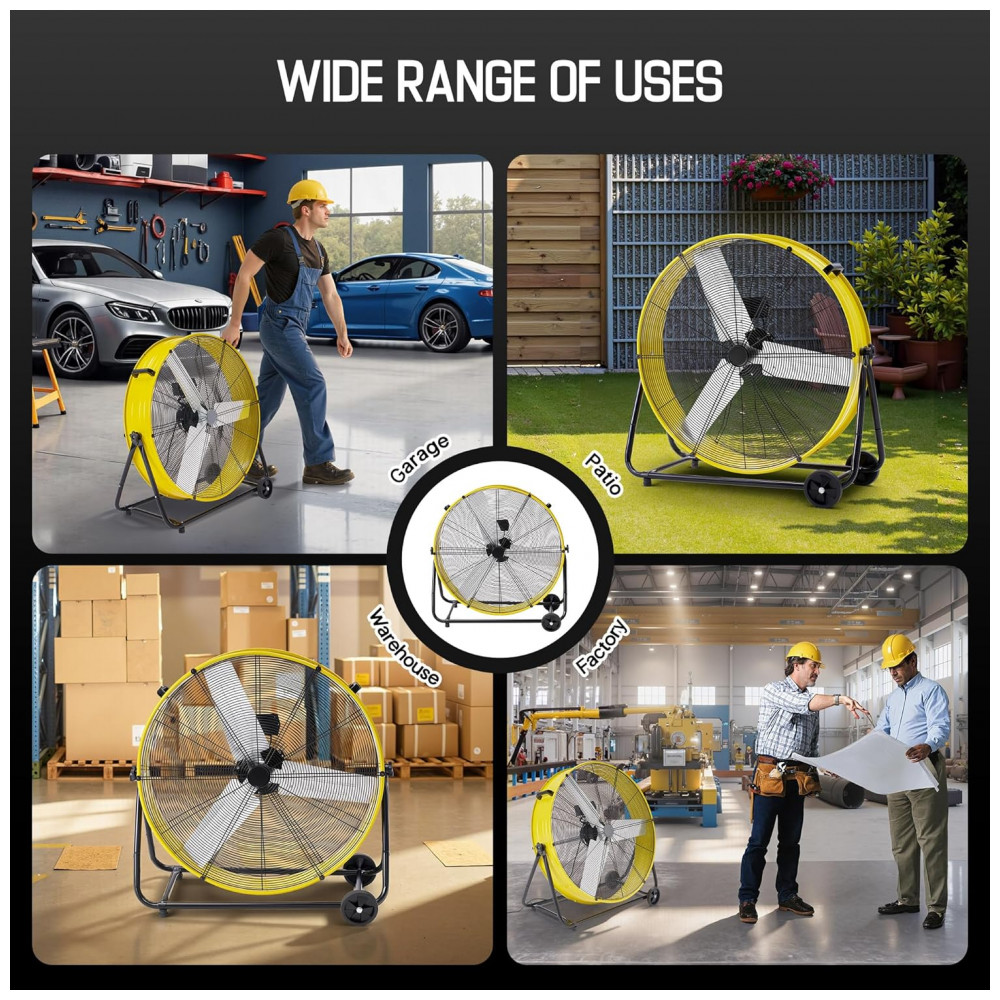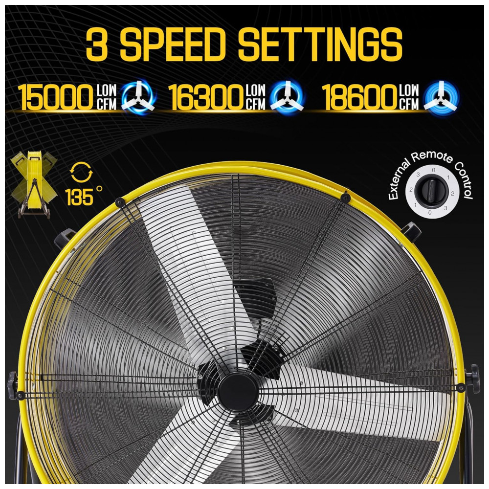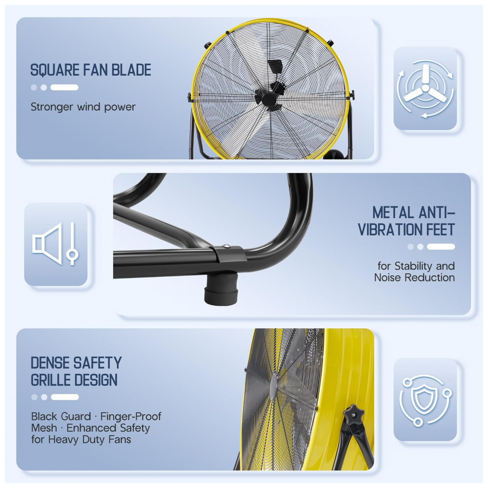 O Ventilador Industrial Albott de 36 polegadas (aproximadamente 91 cm) é projetado para fornecer ventilação potente e eficiente em ambientes comerciais e industriais. Equipado com motor de cobre com ventilação traseira, garante fluxo de ar estável e operação eficiente para uso intenso diário em oficinas, depósitos, fábricas e garagens. Possui 3 velocidades ajustáveis que proporcionam controle flexível do fluxo de ar, com capacidade máxima de até 18.600 CFM, ideal para cobrir grandes áreas. As pás quadradas otimizam a circulação do ar com operação mais silenciosa. A estrutura metálica é revestida com pintura eletrostática amarela resistente, oferecendo durabilidade e proteção contra corrosão. O ventilador conta com grade metálica densa para proteção contra contato acidental, garantindo segurança operacional. A base triangular com pés de borracha antivibração assegura estabilidade e reduz ruídos durante o funcionamento. Produto de uso livre no piso, com controle manual. Voltagem de 110V AC.