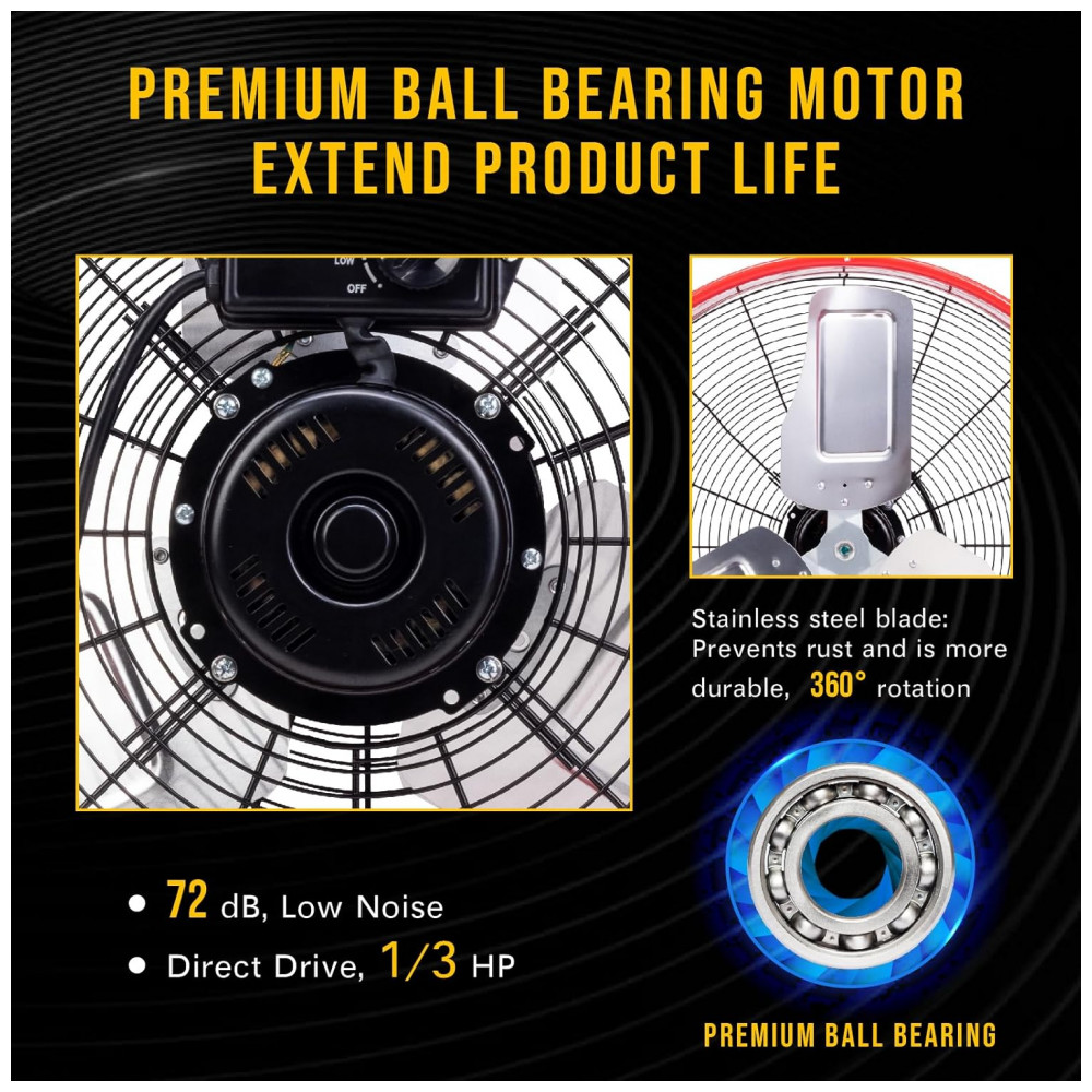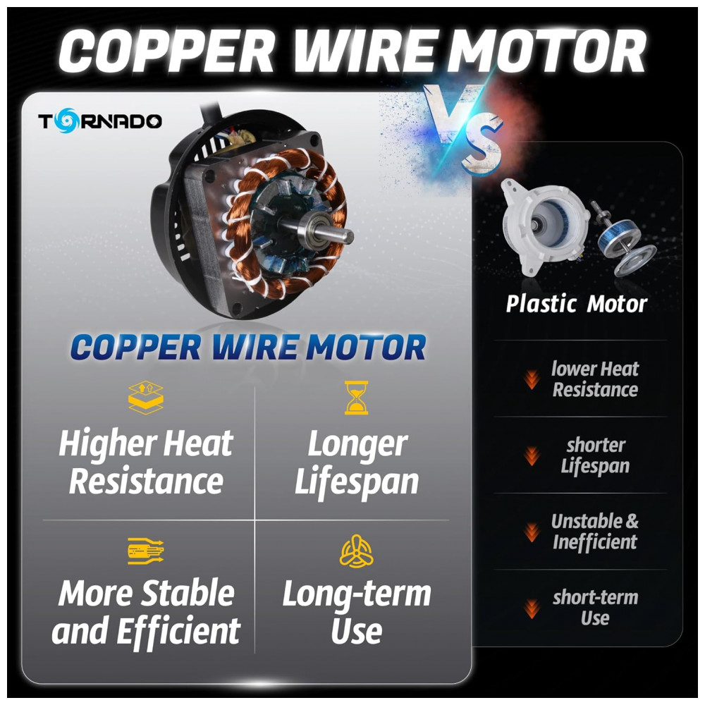 O motor de rolamento de esferas aberto assegura longa vida útil e eficiência operacional. A vazão máxima alcança 8800 pés cúbicos por minuto (CFM)(aproximadamente 249,1 metros cúbicos), com opção de 3 velocidades (8800, 6500 e 5500 CFM). Opera com nível sonoro máximo de 72 dB, sendo ideal para ambientes que exigem ventilação potente com ruído controlado.