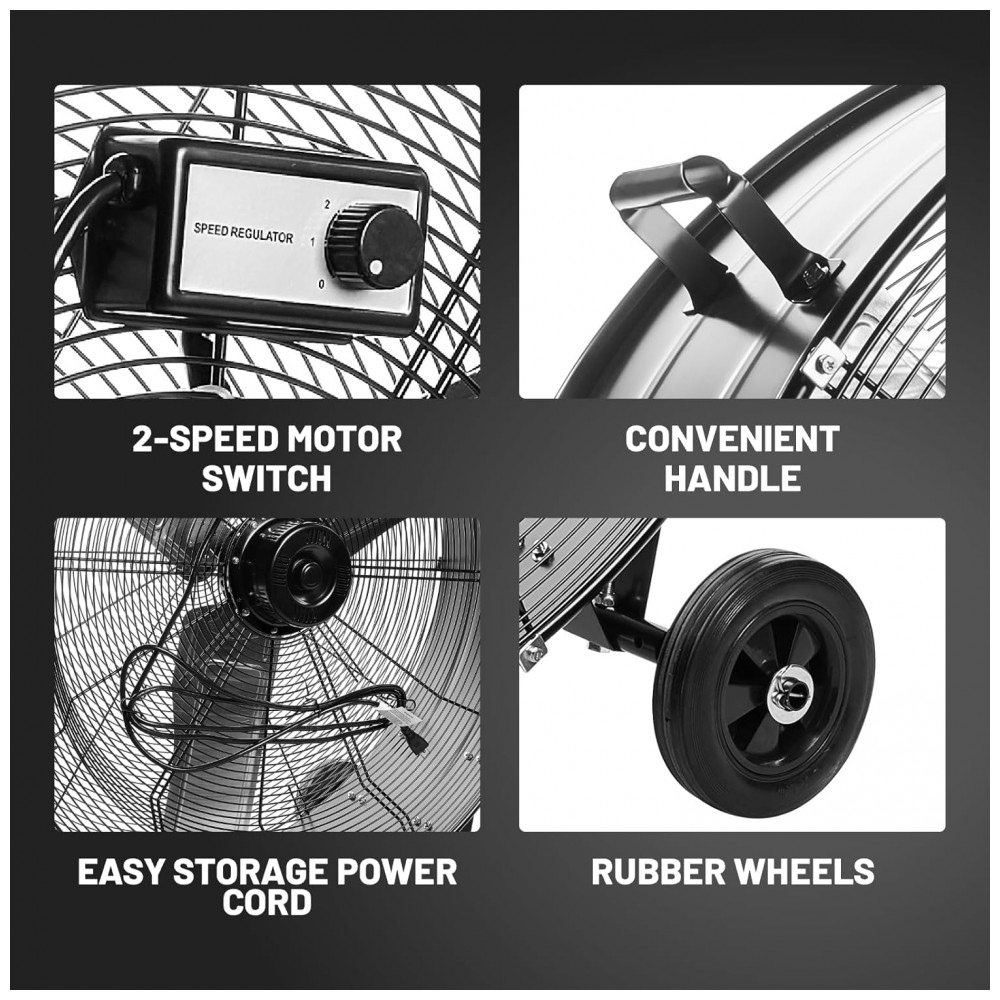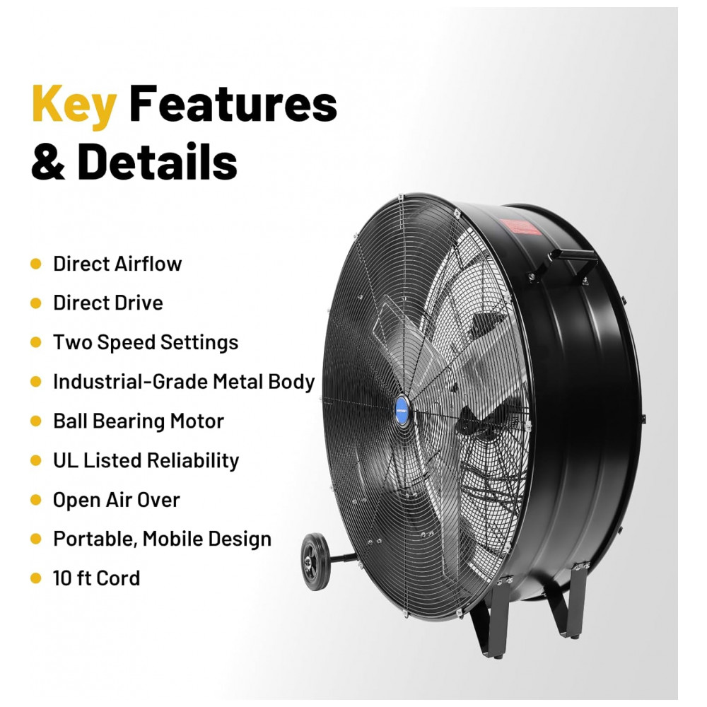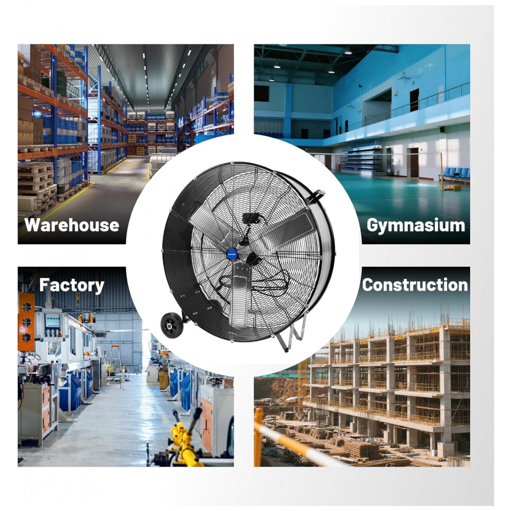 O ventilador industrial de tambor NORTHSKY de 91 cm possui motor potente de (240 watts), proporcionando fluxo de ar de até 15.000 CFM (aproximadamente 424,8 metros cúbicos por minuto) na velocidade máxima e 14.000 CFM (397,0 m³/min) na velocidade baixa. Apresenta duas velocidades ajustáveis para controle flexível do fluxo de ar, fácil controle pelo interruptor localizado na parte traseira do ventilador. Construído com corpo metálico robusto, pás de alumínio e carcaça de aço reforçado, equipado com rolamentos de esferas para garantir durabilidade e operação confiável em ambientes industriais exigentes. Possui grades de proteção para segurança do usuário e isolamento térmico Classe E para proteção contra calor. Rodas pesadas de 15 cm facilitam a mobilidade do equipamento, com cabo elétrico de 3 metros para maior alcance. O nível de ruído operacional é de 85 decibéis, apropriado para grandes espaços industriais, oficinas, armazéns e eventos. Produto certificado UL, com pintura metálica ou preta, garantindo resistência e durabilidade.