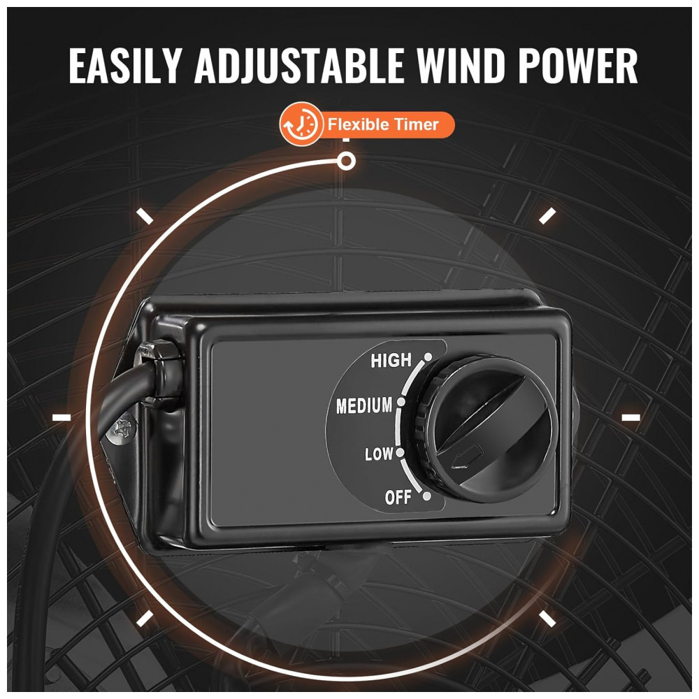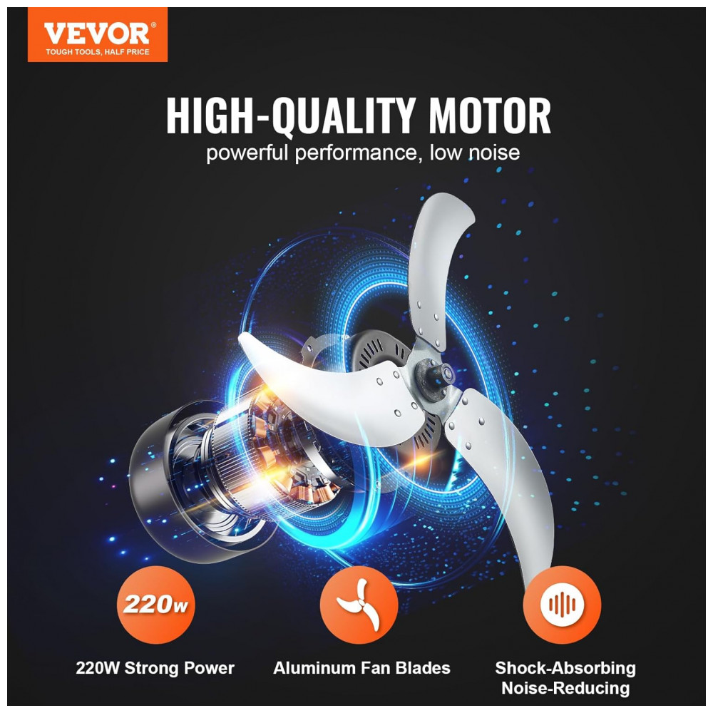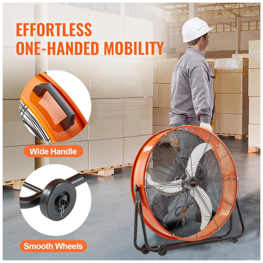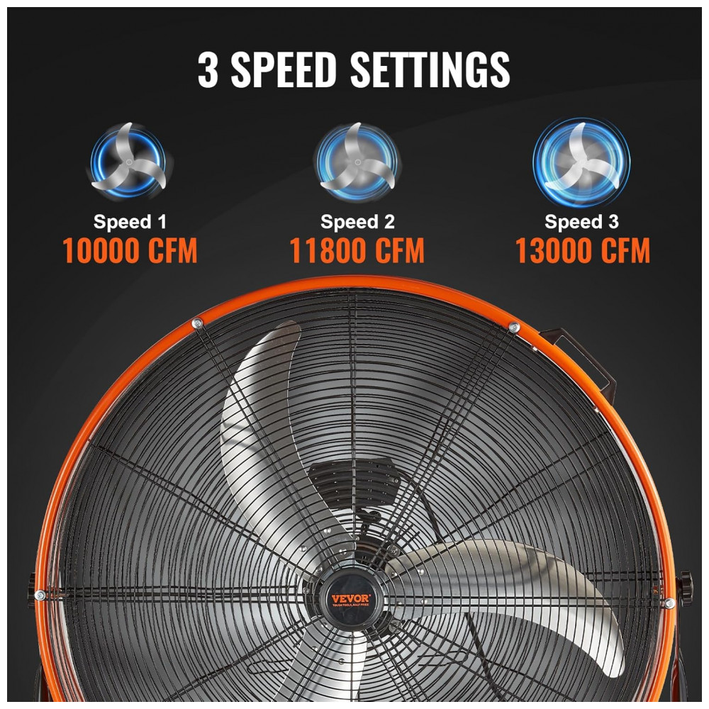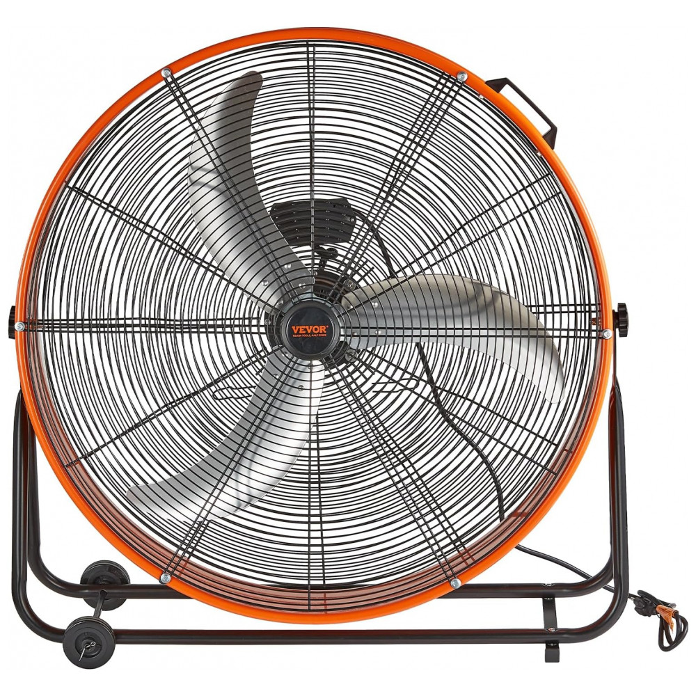 O Ventilador Industrial VEVOR de 30 polegadas (aproximadamente 76 cm) oferece alto desempenho para ventilação de grandes ambientes industriais e comerciais, como armazéns, oficinas, fábricas e porões. Equipado com motor EC de alta qualidade, proporciona funcionamento silencioso com mínima vibração. Conta com três velocidades ajustáveis que permitem personalizar o fluxo de ar, atingindo até 13.000 CFM(aproximadamente 368,1 metros cúbicos) para máxima circulação e renovação do ar. O controle é feito por botão giratório simples, facilitando a troca rápida de velocidades. O ventilador possui inclinação ajustável em 360°, permitindo direção precisa do fluxo conforme a necessidade. Estrutura metálica resistente com acabamento em pintura eletrostática laranja, rodas giratórias para mobilidade fácil em pisos diversos e alça larga para transporte manual sem esforço. Cabo elétrico de aproximadamente 1,5 m para flexibilidade na instalação. Voltagem 110V AC.