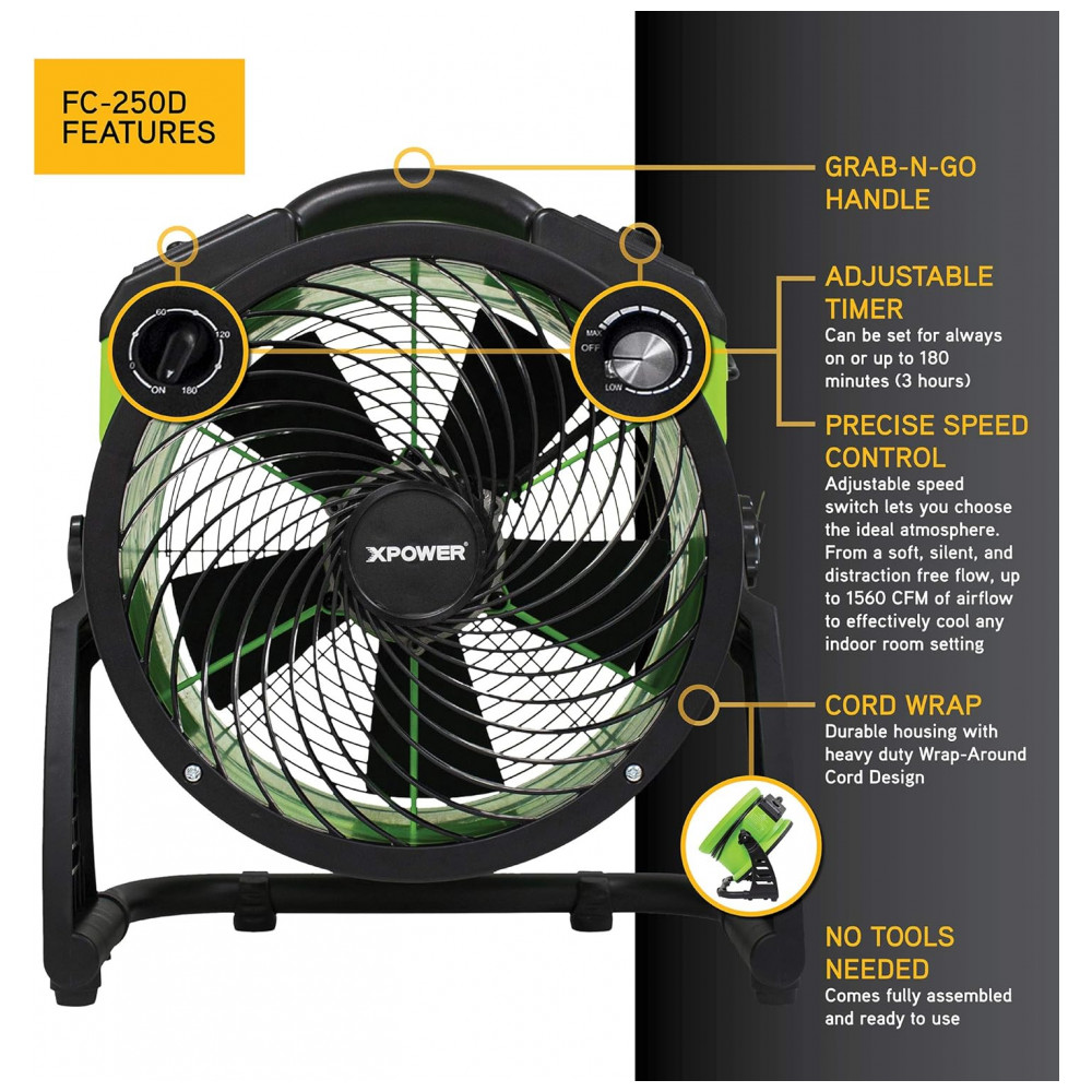 Ventilador Industrial XPOWER FC-250D Verde Motor DC Escovado Velocidade Variável Timer 3 horas 33 cm 1560 CFM 110V