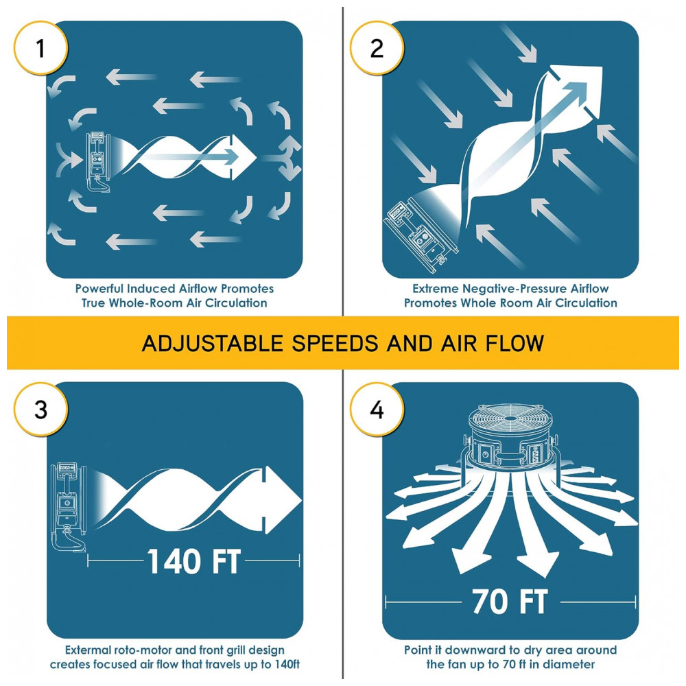 O ventilador industrial XPOWER FC-250D possui motor brushless DC de alta eficiência, oferecendo ampla faixa de velocidades para ajustar o fluxo de ar ideal com consumo mínimo de energia. Pode gerar até 1560 CFM (aproximadamente 44,2 metros cúbicos por minuto), proporcionando ventilação eficaz em ambientes internos como escritórios, salas e residências. Equipado com controle de velocidade variável e timer programável de até 3 horas, permitindo operação contínua ou desligamento automático. O design inclui grelha espiral única e pás com inclinação profunda para direcionar o fluxo de ar focado e estendido até cerca de 43 metros. O ventilador possui base com rotação de 360° para ajuste do ângulo de vento conforme a necessidade. Estrutura em polipropileno com cabo de 3 metros, alça para transporte e montagem fácil. Produto certificado ETL e com eficiência energética, é silencioso e de baixa manutenção, adequado para uso profissional e doméstico.