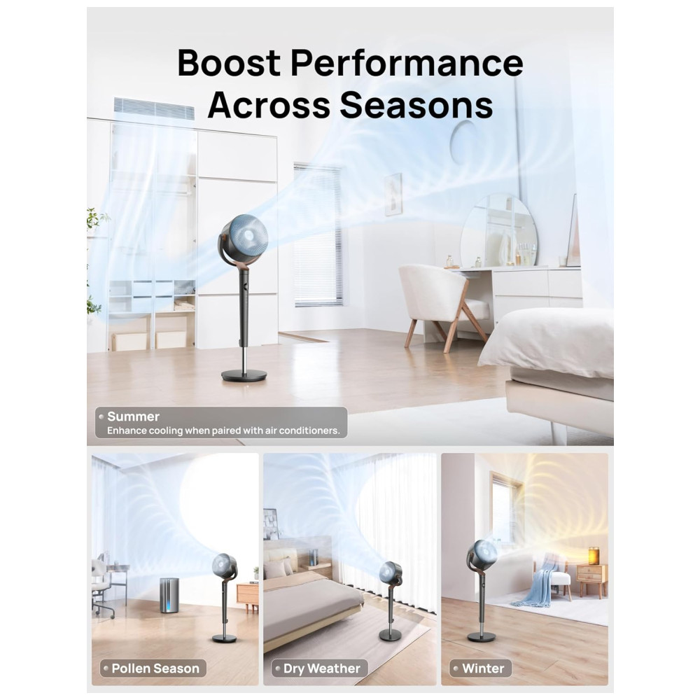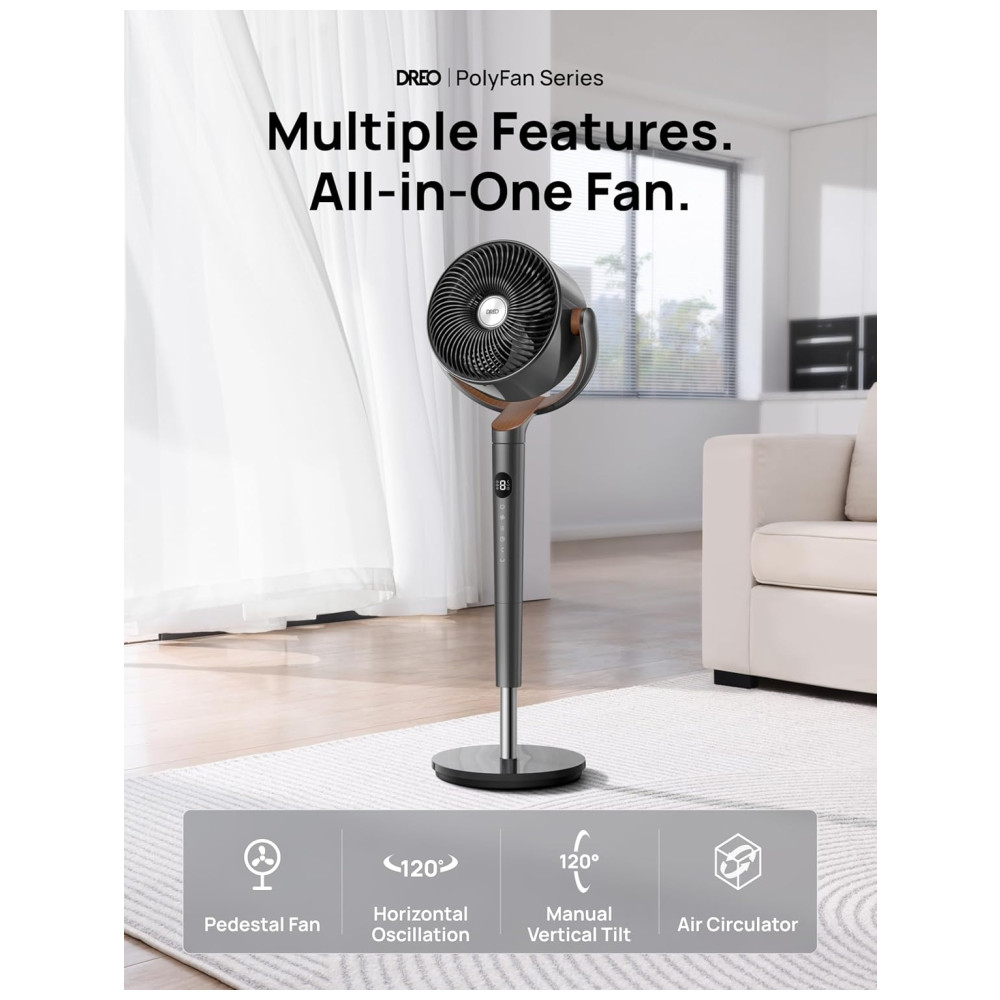 O ventilador de pé Dreo PolyFan é um produto multifuncional que combina as funções de ventilador de pedestal, ventilador oscilante e circulador de ar em um único aparelho. Com 8 velocidades de vento e 3 modos de operação, este produto é capaz de proporcionar uma circulação de ar potente e silenciosa em qualquer ambiente interno, como residências, quartos, escritórios e salas de estar.