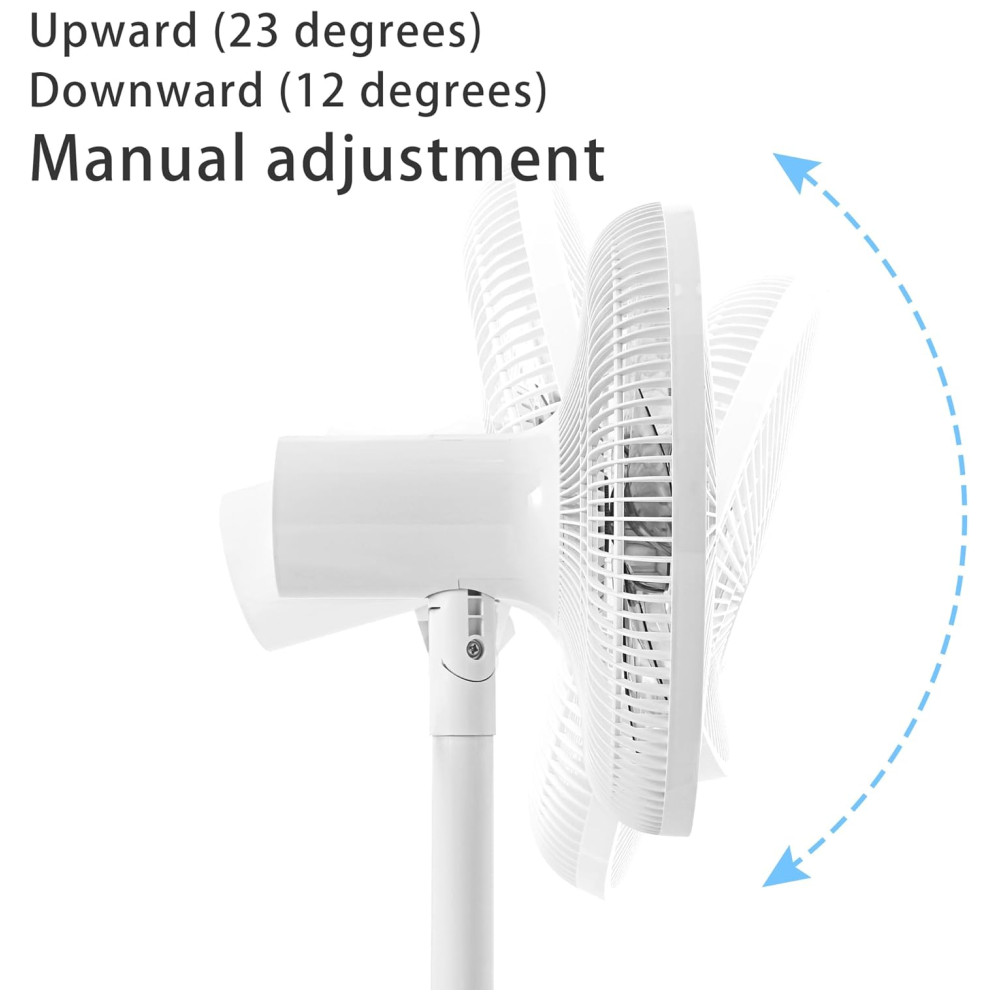 A altura do ventilador é ajustável de 31 a 45 graus, permitindo que você direcione o fluxo de ar exatamente onde necessário. Além disso, a cabeça do ventilador pode ser inclinada manualmente até 23 graus para cima ou 12 graus para baixo, ou em qualquer ponto entre esses ângulos, para maior flexibilidade no posicionamento.