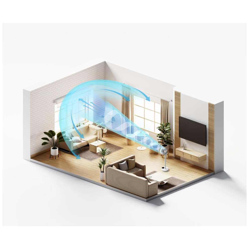 Com a inovadora oscilação WOOZOO, este ventilador oferece circulação de ar total no ambiente. A oscilação vertical de 360° e horizontal de 90° garantem uma cobertura mais ampla, contribuindo para uma melhor circulação do ar em toda a área. Coloque o ventilador próximo à janela ou entrada para regular a qualidade do ar: direcione-o para fora para ventilar o ambiente ou para dentro para trazer ar fresco de fora.