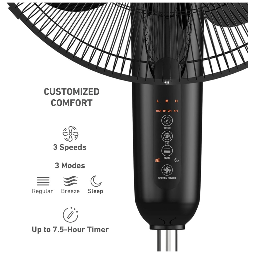 A cabeça do ventilador pode ser inclinada em até 30 graus e a altura ajustada de 93 a 111 cm, permitindo que você direcione o fluxo de ar exatamente onde precisar. O temporizador de desligamento automático de até 7,5 horas oferece conveniência e economia de energia.