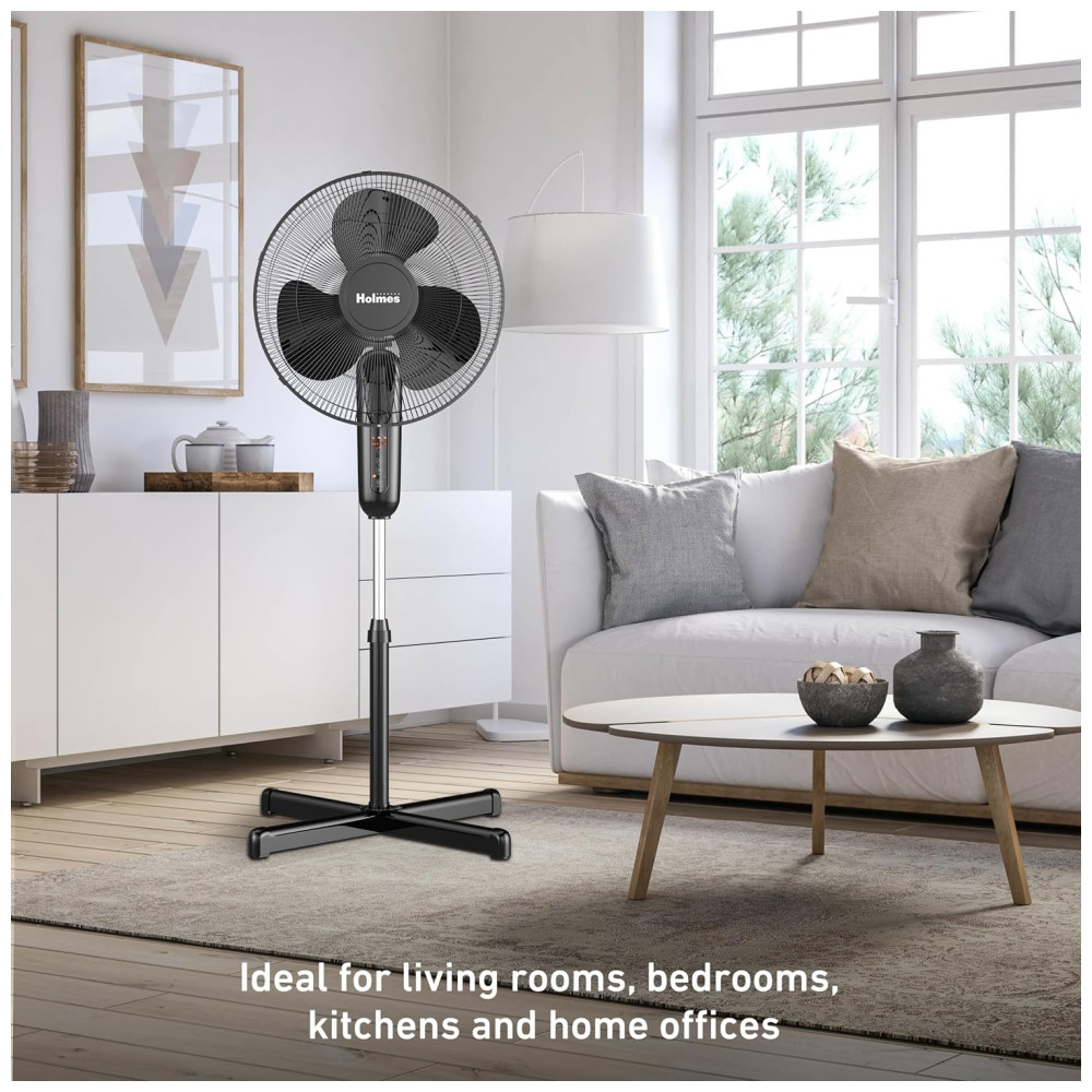 Completamente ajustável e silencioso, o ventilador Holmes 16 é projetado para se integrar perfeitamente em qualquer espaço amplo. Ele já vem pronto para uso e inclui um controle remoto para maior comodidade.