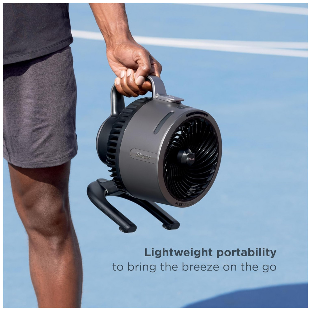Com base estável para apoio em superfícies, o FlexBreeze HydroGo utiliza formato de ventilador de mesa com três pás, garantindo distribuição uniforme do fluxo de ar. A função de névoa evaporativa, associada ao alcance de ventilação de até 70 pés, contribui para maior conforto térmico local em dias quentes sem molhar excessivamente superfícies próximas. A alimentação híbrida por energia elétrica e bateria recarregável oferece flexibilidade para uso em locais com ou sem tomada próxima.