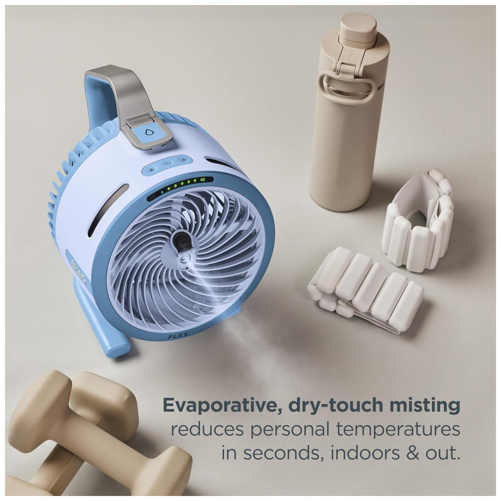 Com base estável e três pás, o FlexBreeze HydroGo Pro distribui o fluxo de ar de forma uniforme, auxiliando na circulação de ar, ventilação geral e apoio em secagem leve de superfícies. A função de névoa evaporativa integrada, associada ao reservatório embutido, torna o equipamento adequado para uso pessoal em dias quentes, tanto em ambientes internos quanto em áreas externas protegidas. A alimentação híbrida por energia elétrica e bateria recarregável amplia a flexibilidade de uso em locais com ou sem tomada disponível.