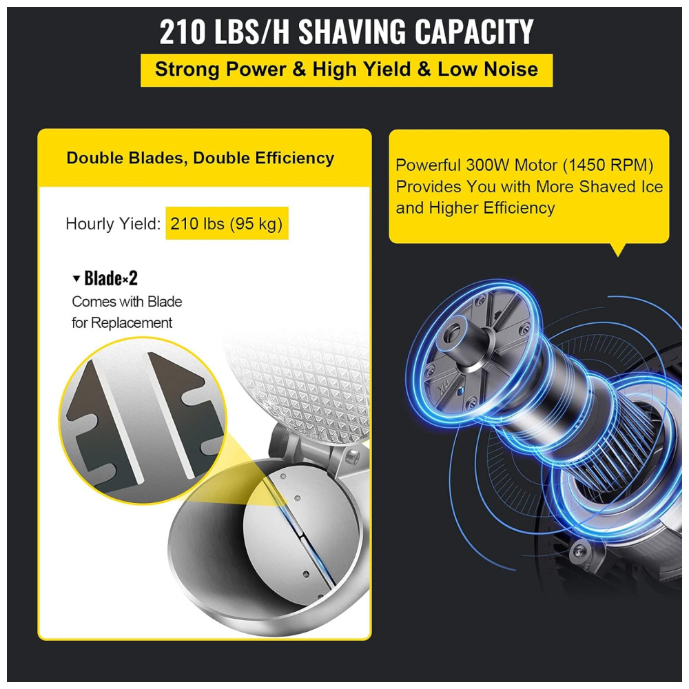 Maior eficiência de trituração nosso cortador de gelo elétrico apresenta maior eficiência de corte de gelo e rendimento por hora, graças ao design de lâmina dupla, com a qual pode dobrar a eficiência do corte de gelo em comparação com um único. Alimentado pelo motor de cobre de 300W, cuja velocidade de rotação chega a 1450 r , min, nossa máquina de fazer gelo raspado pode produzir 210 lbs 95 kg por hora, atendendo às demandas urgentes rapidamente em um curto espaço de tempo. Além disso, outra lâmina é fornecida para substituição.