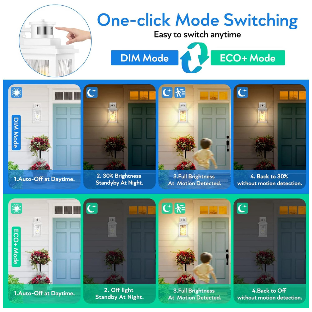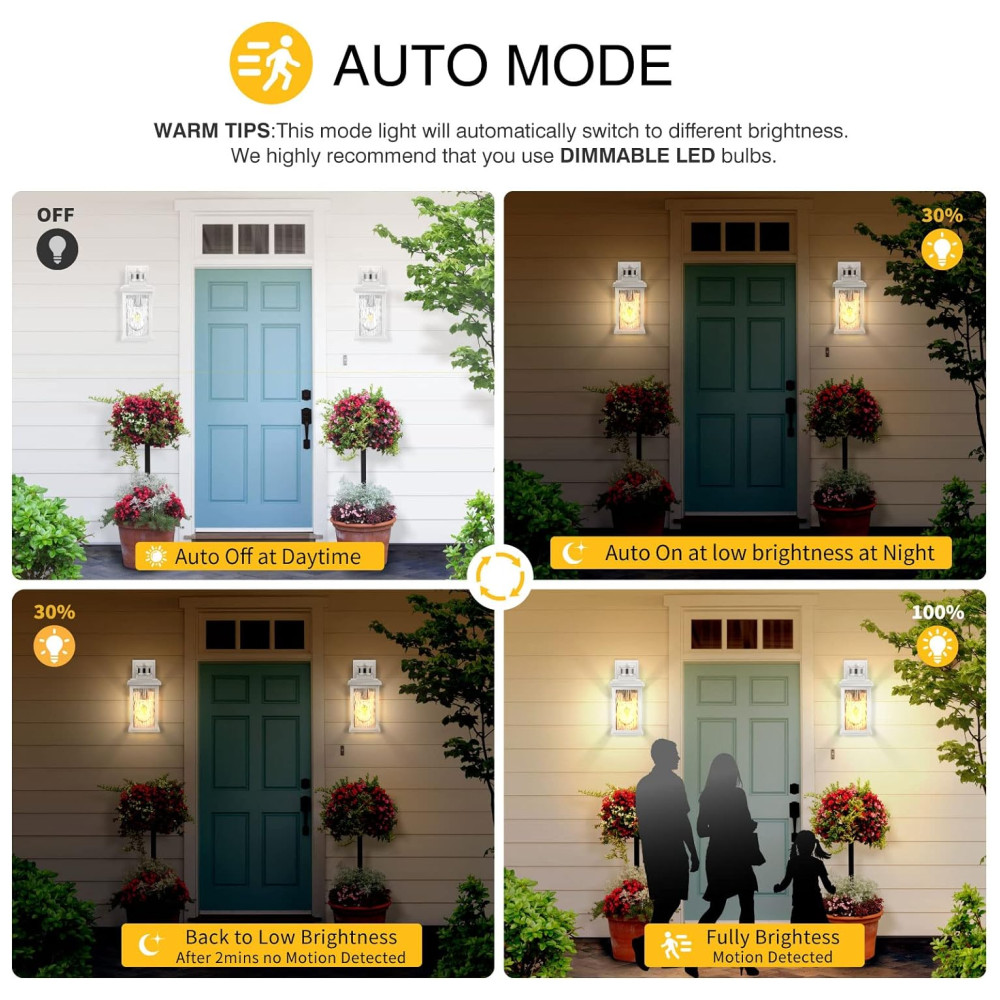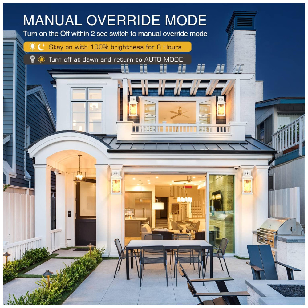 Modo de substituição manual exclusivo estas lanternas externas para varanda frontal podem estar continuamente com 100 de brilho à noite, como cenas de festa. Para mudar para o modo manual de um automático e ligar o interruptor de parede com 0,5 2 segundos … Neste modo, a luminária externa liga e mantém 100 de brilho por aproximadamente 8 horas, mas desliga automaticamente Alvorecer.