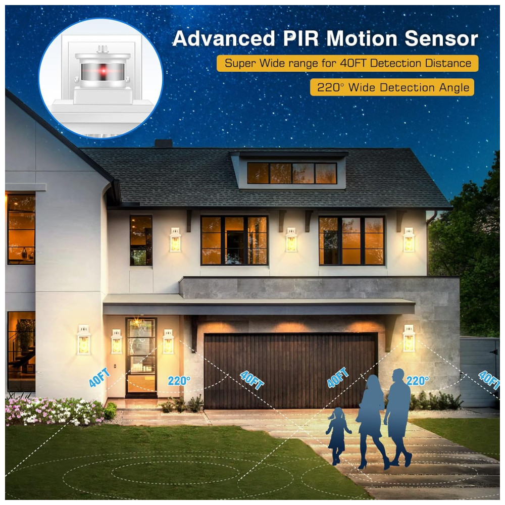 Nossas luzes externas para a casa integraram tecnologia PIR avançada e sensores de fotocélula. Ele será ligado automaticamente ao pôr do sol com 30 de luz fraca, ativado com 100 de luz alta assim que o movimento for detectado, reverterá para 30 de brilho após 2 minutos sem movimento e será desligado automaticamente ao amanhecer. além disso, uma gama precisamente ampla de sensores de movimento de 12 metros de distância, 220 graus, liberte suas mãos com tecnologia de sensores inteligentes e economize energia com eficiência.