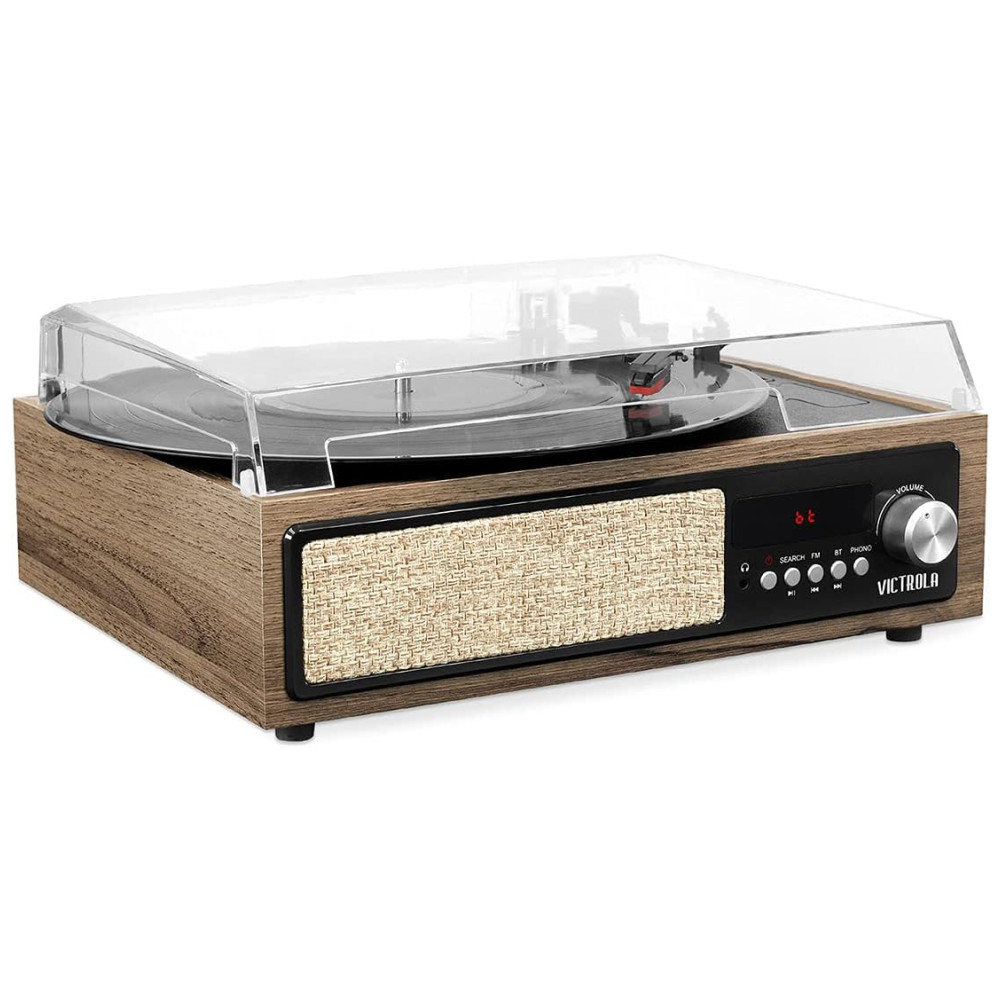 Vitrola 3 em 1 Gravador Bluetooth com Alto Falantes Integrados e Toca Discos de 3 Velocidades Farmhouse Walnut VICTROLA VTA 67 ESP Marrom Claro